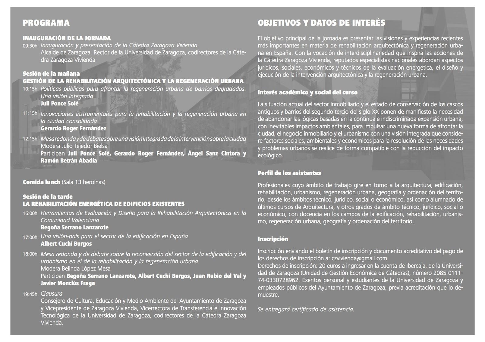 Inscripción: Habrá de rellenarse el boletín de inscripción y remitirse, junto a documento acreditativo del pago de los derechos de inscripción, a la dirección electrónica czvivienda@gmail.com Los derechos de inscripción son de veinte euros. El personal y estudiantes de la Universidad de Zaragoza y los empleados públicos del Ayuntamiento de Zaragoza están exentos. El ingreso se realizará en la cuenta de Ibercaja, de la Universidad de Zaragoza (Unidad de Gestión Económica de Cátedras), número 2085-0111-74-0330728962.