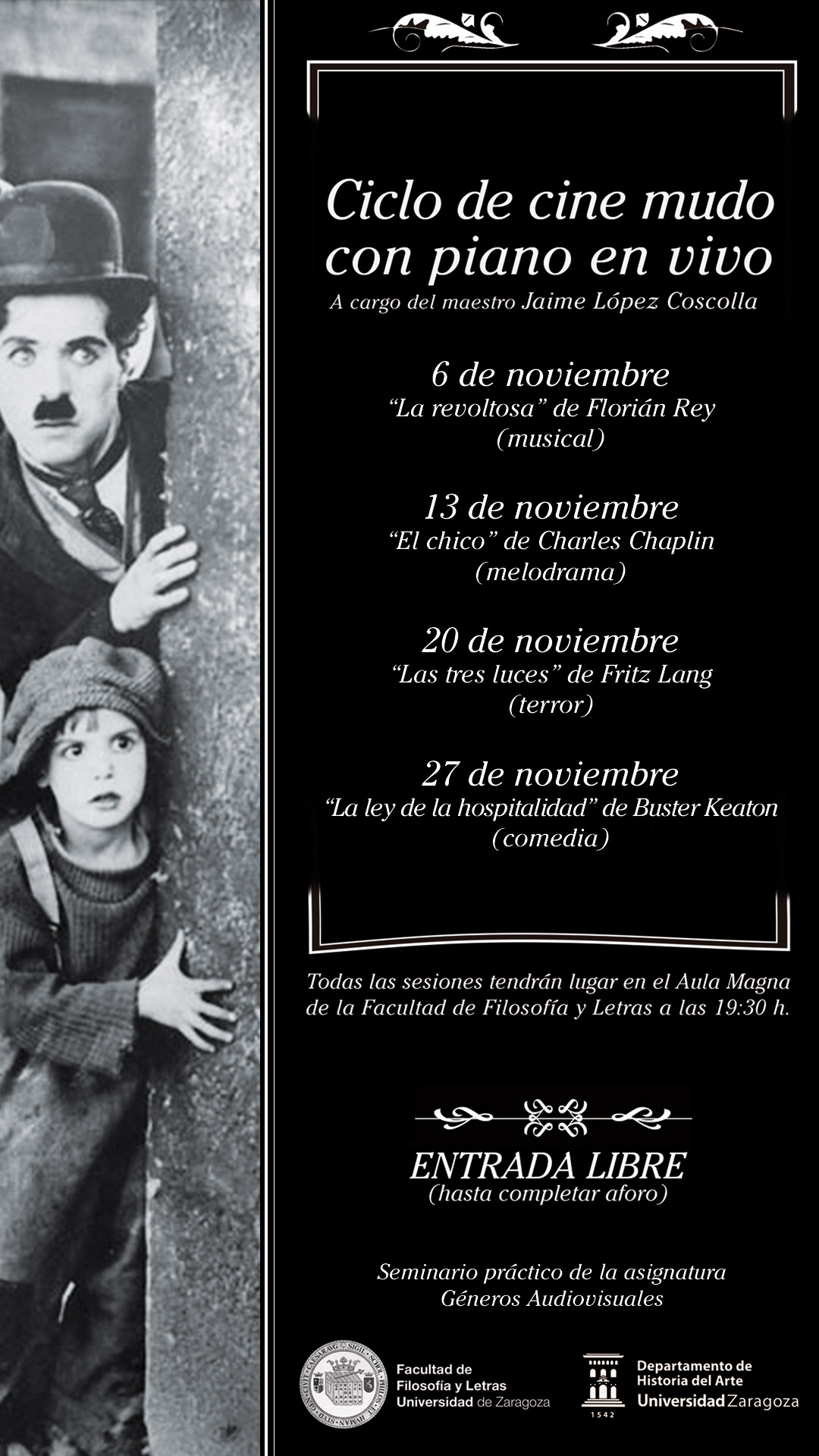 Este jueves, día 6 de noviembre, con la proyección de "La Revoltosa", de Florián Rey, se inaugura el Tercer Ciclo de cine mudo con piano en directo, a cargo del maestro Jaime López Coscolla. La actividad está adscrita a la asignatura "Géneros Audiovisuales" (Prof. Dra. Martínez Herranz), como seminario práctico.