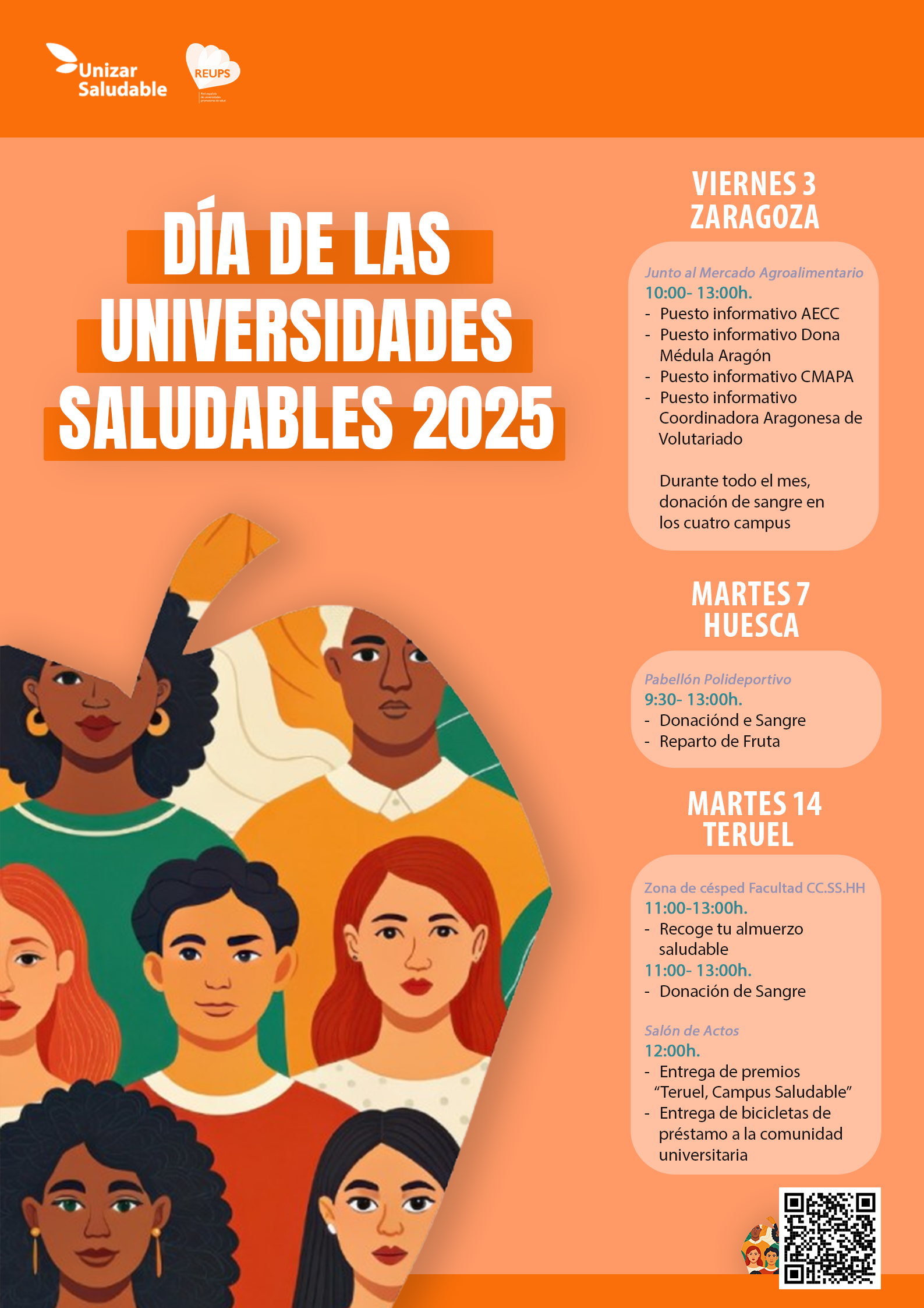 En Huesca, el día 7 de octubre se llevará a cabo una jornada de reparto de fruta y de donación de sangre, mientras que, en Teruel, el 14 de octubre, se celebrará la entrega de premios de la IX edición de “Teruel, Campus Saludable” a los mejores TFG y TFM, la entrega de bicicletas del programa de préstamo y, al igual que en Huesca, se organizará una jornada de reparto de fruta y donación de sangre.