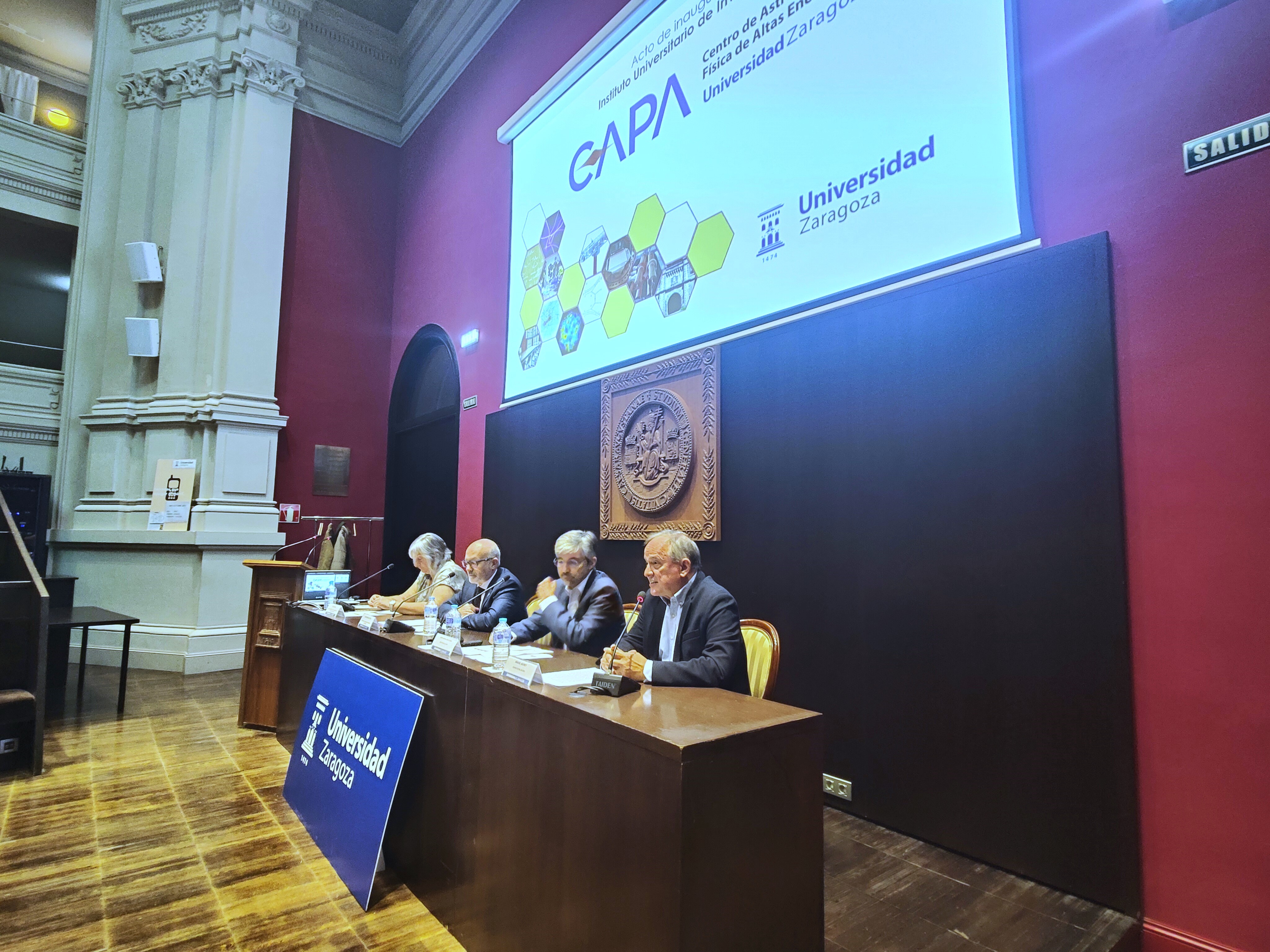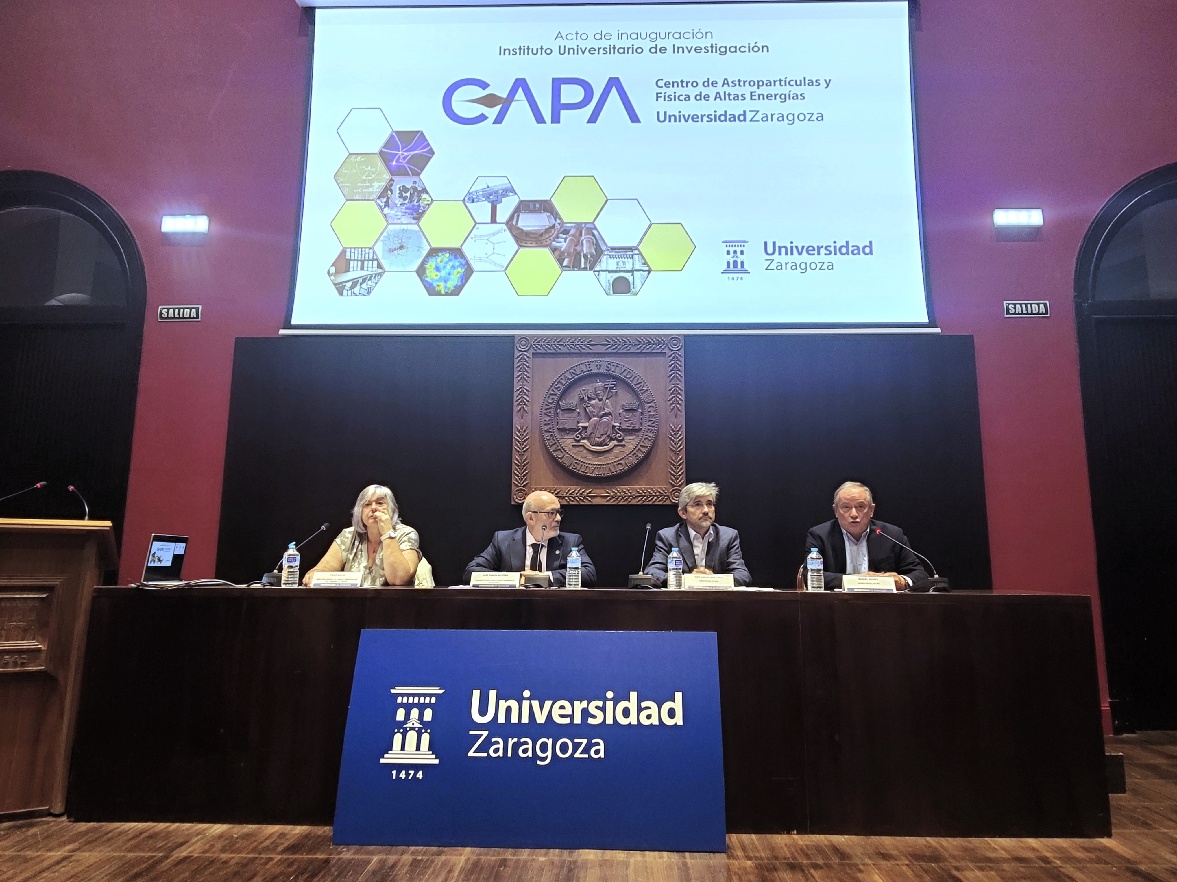 El Centro de Astropartículas y Física de Altas Energías (CAPA) de la Universidad de Zaragoza -creado en el 2019- pasa a ser un Instituto Universitario de Investigación, un paraguas que le permitirá acceder a convocatorias más competitivas, más recursos y mayor proyección internacional. Esta mayoría de edad se ha celebrado hoy, con un acto que ha tenido lugar en el Aula Magna del Paraninfo de la Universidad de Zaragoza, al que ha asistido la rectora de la Universidad de Zaragoza, Rosa Bolea, el vicerrector de Planificación y Desarrollo Estratégico, José Ramón Beltrán, la directora general de Ciencia e Investigación del Gobierno de Aragón, Pilar Gayán, el director actual del CAPA, Igor García Irastorza, así como su anterior director, Manuel Asorey.