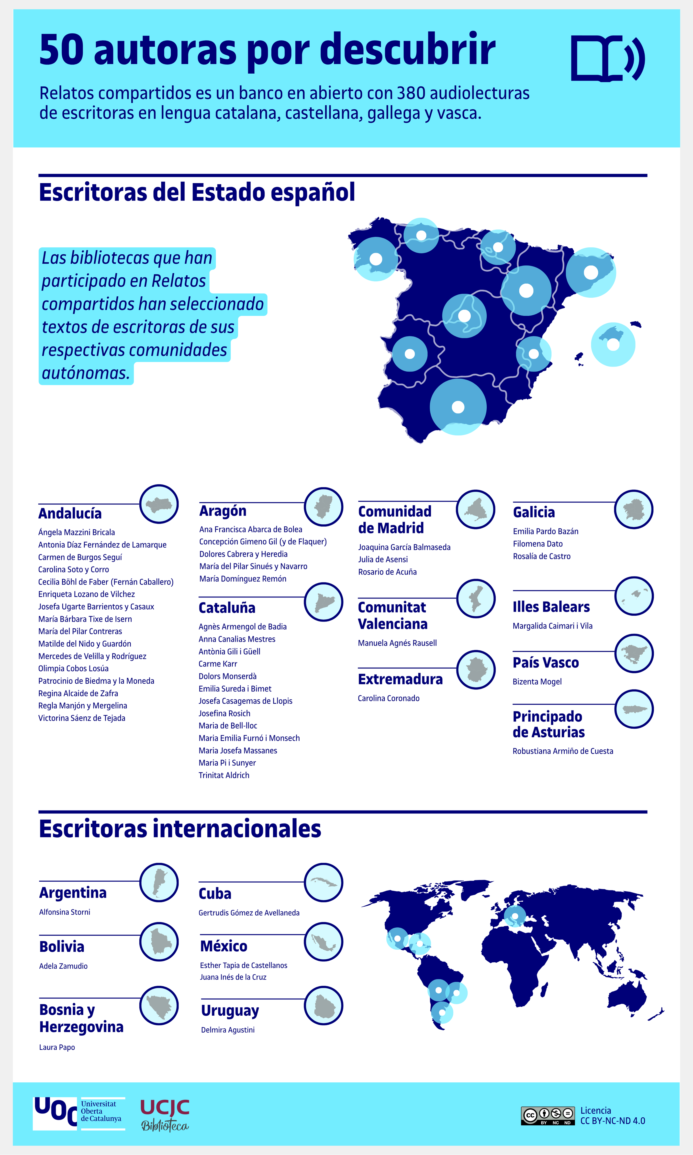 La Biblioteca de la UOC se suma un año más al Día de las Escritoras (13 de octubre), convocado por la Biblioteca Nacional de España, con la cuarta edición de Relatos compartidos. Se trata de un banco sonoro colaborativo que da voz a las obras de escritoras a lo largo de la historia de la literatura y que ya suma 380 audiolecturas.