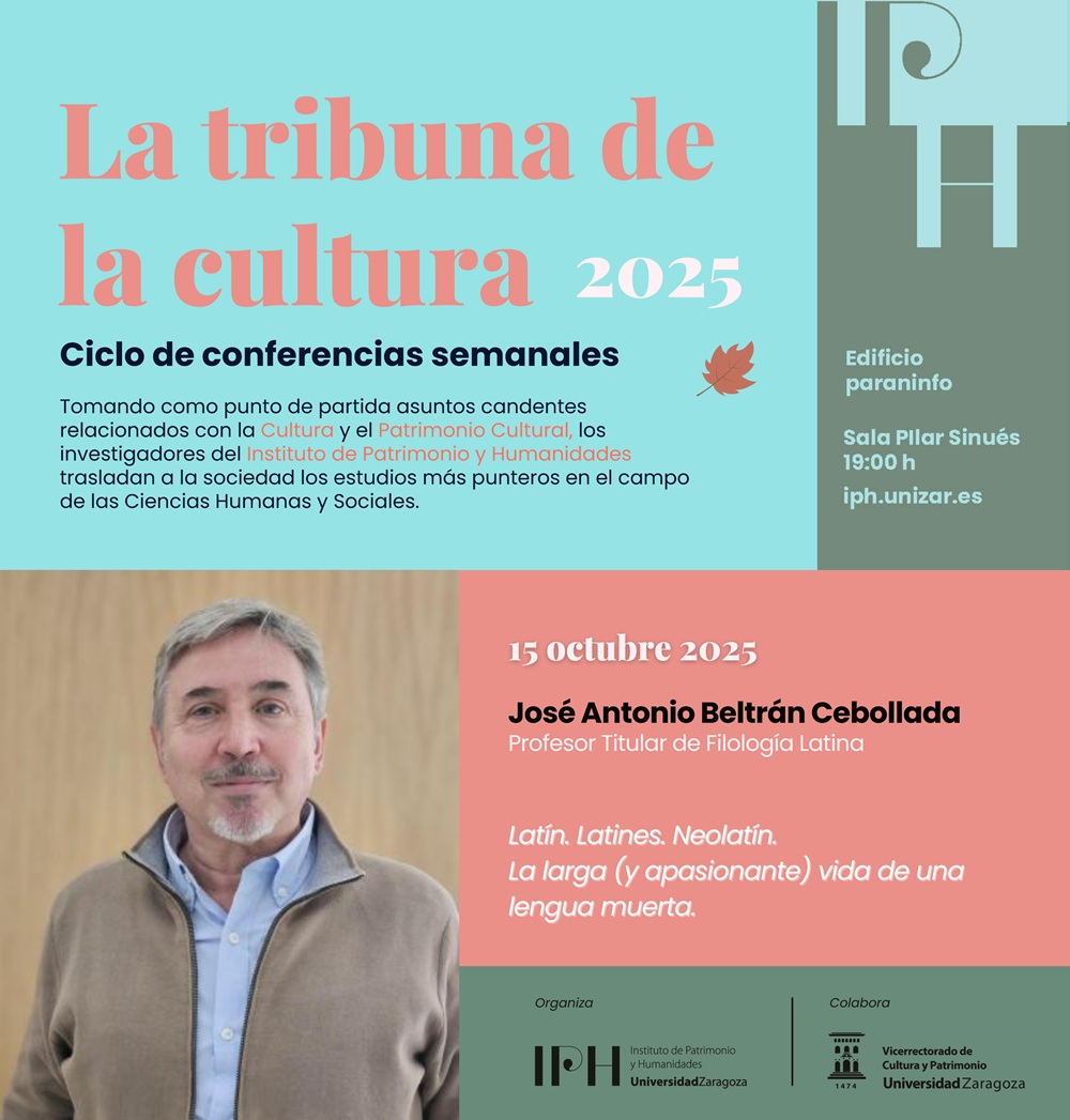 El Instituto de Patrimonio y Humanidades de la Universidad de Zaragoza (IPH), en colaboración con el Vicerrectorado de Cultura y Patrimonio, inaugura la 6.ª edición de su ciclo de conferencias de divulgación ‘La Tribuna de la Cultura’ mañana miércoles, 15 de octubre, a las 19 h en la sala Pilar Sinués del Edificio Paraninfo. El investigador José Antonio Beltrán Cebollada, profesor titular de Filología Latina y decano de la Facultad de Filosofía y Letras, impartirá la conferencia "Latín. Latines. Neolatín. La larga (y apasionante) vida de una lengua muerta".