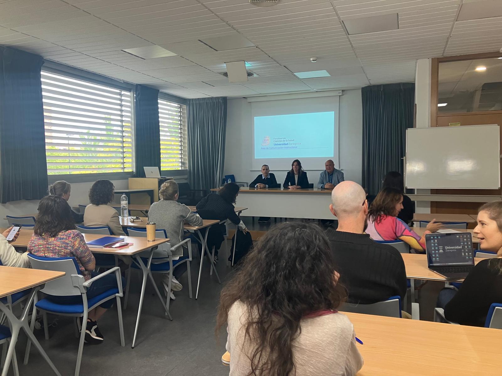 En una sesión abierta a toda la comunidad universitaria, la Facultad de Ciencias de la Salud presentó ayer su nueva Área de Comunicación Institucional. En sus intervenciones, tanto Elena Estébanez de Miguel como Miguel Ángel Esteban Navarro pusieron en valor la propuesta del centro, que se sitúa como referente al ser uno de los primeros en incorporar de manera diferenciada un área de comunicación institucional.