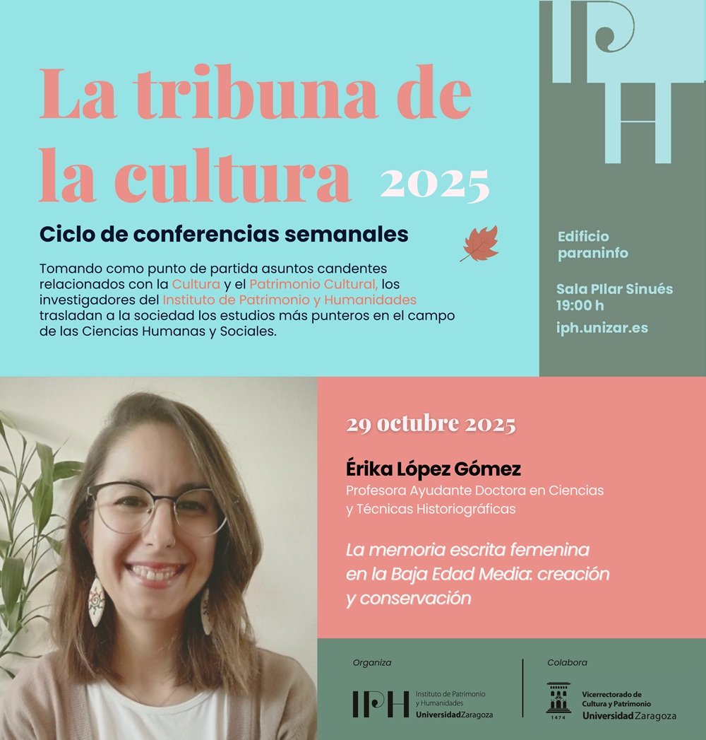 El IPH, en colaboración con el Vicerrectorado de Cultura y Patrimonio, continúa con su ciclo de conferencias semanales de divulgación ‘La Tribuna de la Cultura’ el próximo miércoles, 29 de octubre, a las 19 h en la sala Pilar Sinués del Edificio Paraninfo. La investigadora Érika López Gómez, Profesora Ayudante Doctora en Ciencias y Técnicas Historiográficas, impartirá la conferencia "La memoria escrita femenina en la Baja Edad Media: creación y conservación".