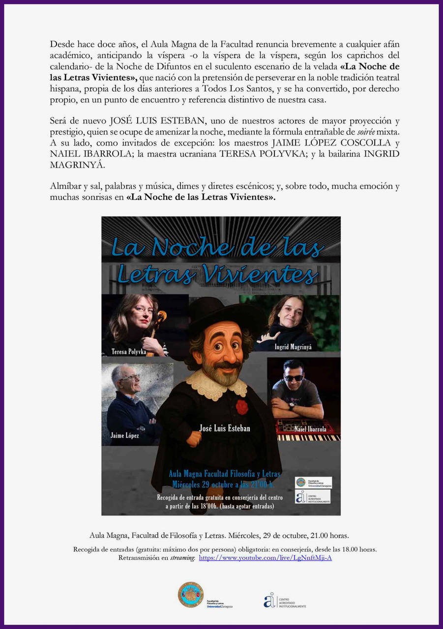 calendario- de la Noche de Difuntos en el suculento escenario de la velada «La Noche de las Letras Vivientes», que nació con la pretensión de perseverar en la noble tradición teatral hispana, propia de los días anteriores a Todos Los Santos, y se ha convertido, por derecho propio, en un punto de encuentro y referencia distintivo de nuestra casa.