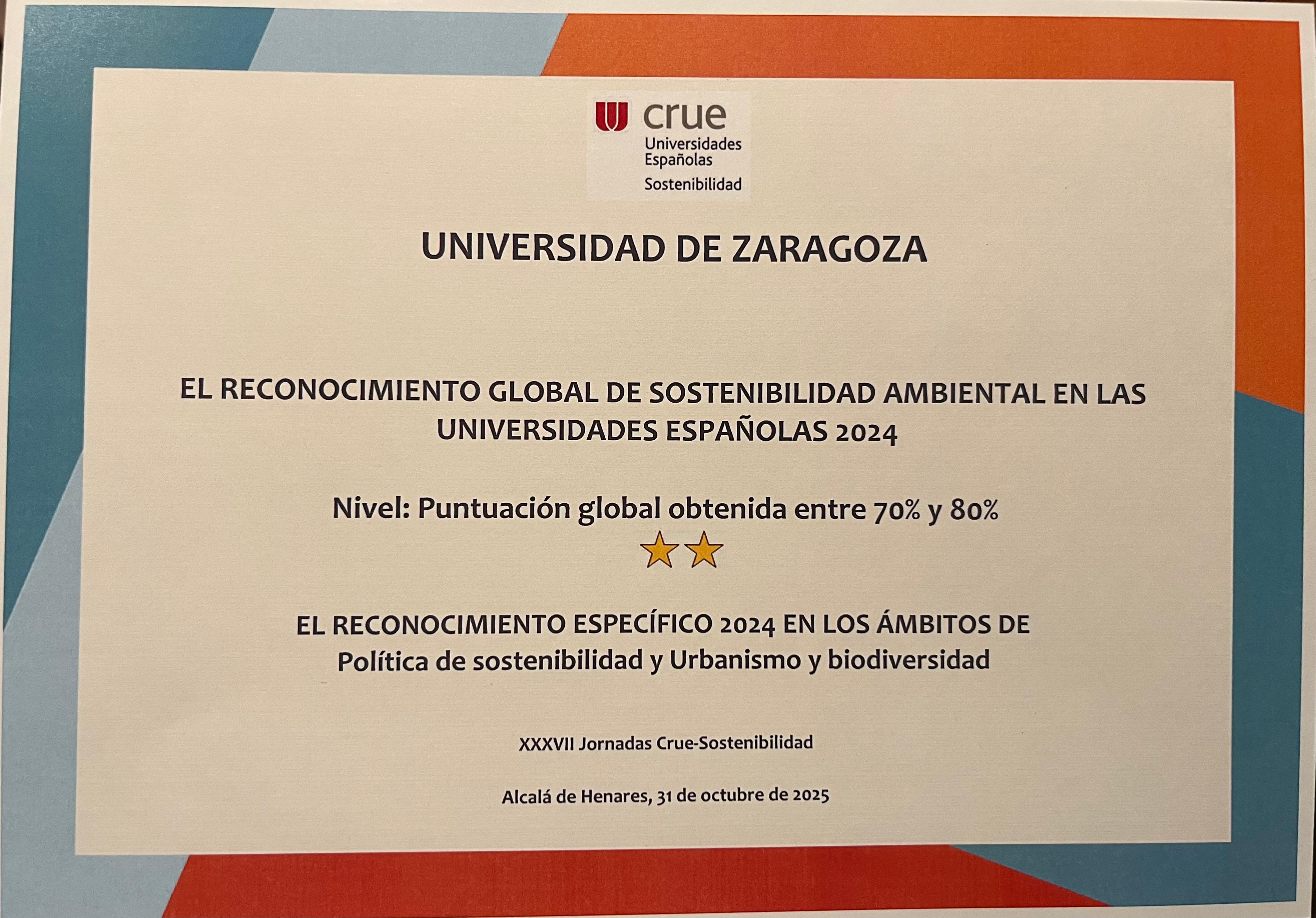 El reconocimiento fue entregado durante la Comisión Sectorial CRUE-Sostenibilidad, celebrada los días 29, 30 y 31 de octubre en la Universidad de Alcalá de Henares, bajo el lema «Hacia una universidad comprometida con la sostenibilidad social». En este encuentro, la Universidad de Zaragoza participó activamente a través de un equipo integrado por los tres Vicerrectorados ligados al Observatorio de Sostenibilidad: Vicerrectorado de Infraestructuras y Sostenibilidad, Vicerrectorado de Planificación y Desarrollo Estratégico, y Vicerrectorado de Comunidad Universitaria y Compromiso Social.