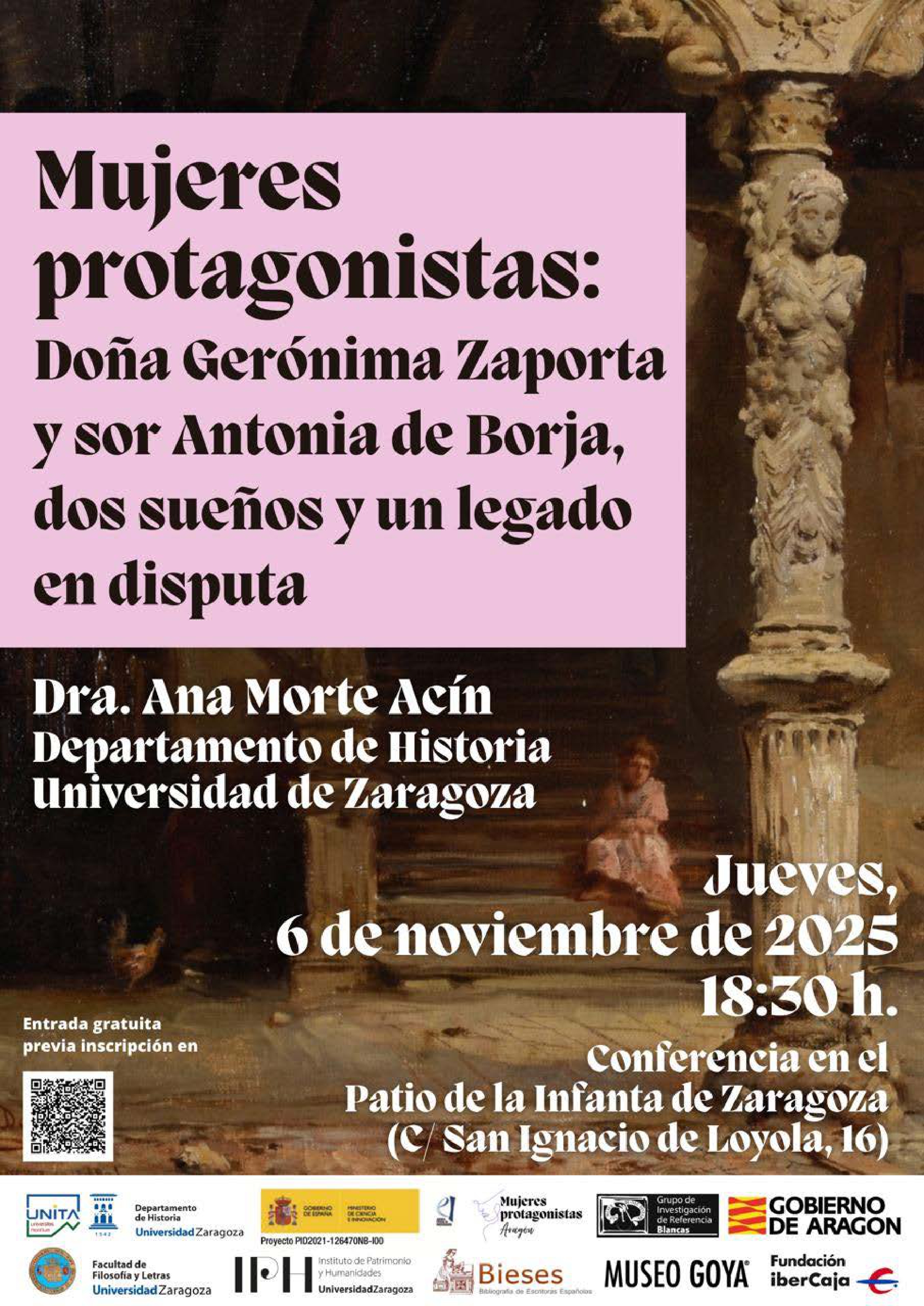 El ciclo Mujeres Protagonistas Aragón inicia el curso 2025-2026 con una nueva conferencia. Será el próximo jueves, 6 de noviembre, a las 18:30 h en el Patio de la Infanta de Zaragoza. La charla, impartida por Ana Morte Acín, profesora del Departamento de Historia de la Universidad de Zaragoza e investigadora del Instituto de Patrimonio y Humanidades (IPH), lleva por título: "Mujeres Protagonistas: Doña Gerónima Zaporta y sor Antonia de Borja, dos sueños y un legado en disputa”. Como siempre, la entrada es libre, en este caso previa inscripción en la web www.fundacionibercaja.es/centros/ibercaja-patio-de-la-infanta.