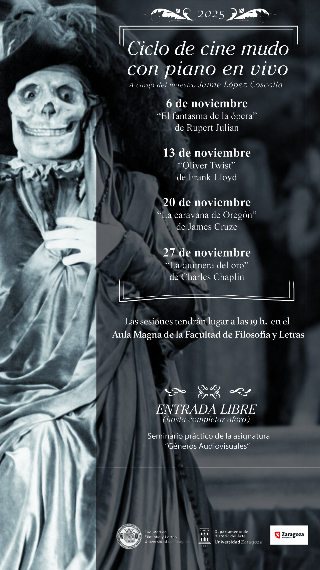Se reanuda, un año más desde 2012, el CICLO DE CINE MUDO CON PIANO EN DIRECTO, a cargo del Maestro Jaime López Coscolla, con la película El fantasma de la ópera, de Rupert Julian (1925).