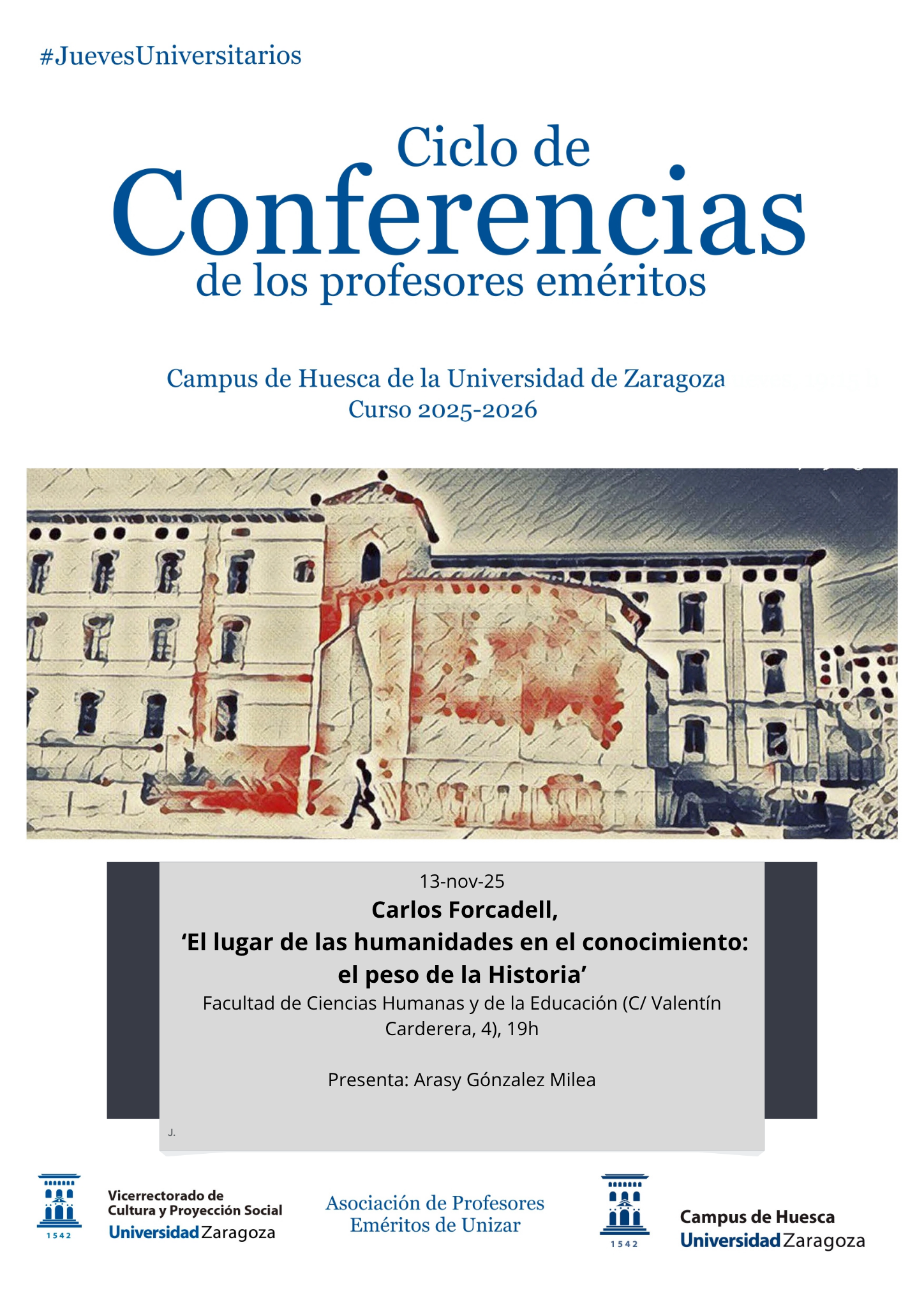 ‘El lugar de las humanidades en el conocimiento: el peso de la Historia’ es el título de la conferencia que impartirá Carlos Forcadell este jueves, 13 de noviembre, en el Campus de Huesca. El catedrático de Historia Contemporánea de Unizar abordará en esta sesión “la importancia decisiva” de los conocimientos humanísticos, no solo para la educación, el disfrute cultural y la comprensión del mundo, sino también para el ecosistema global del conocimiento humano y para el funcionamiento de las sociedades democráticas. La Facultad de Ciencias Humanas y de la Educación (c/ Valentín Carderera, 4) acogerá, a las 19 horas, esta ponencia, con la que se abre una nueva edición del Ciclo de Conferencias de los Profesores Eméritos en el Campus altoaragonés. Arasy González Milea, profesora de la Facultad anfitriona, introducirá esta sesión, que está abierta al público.