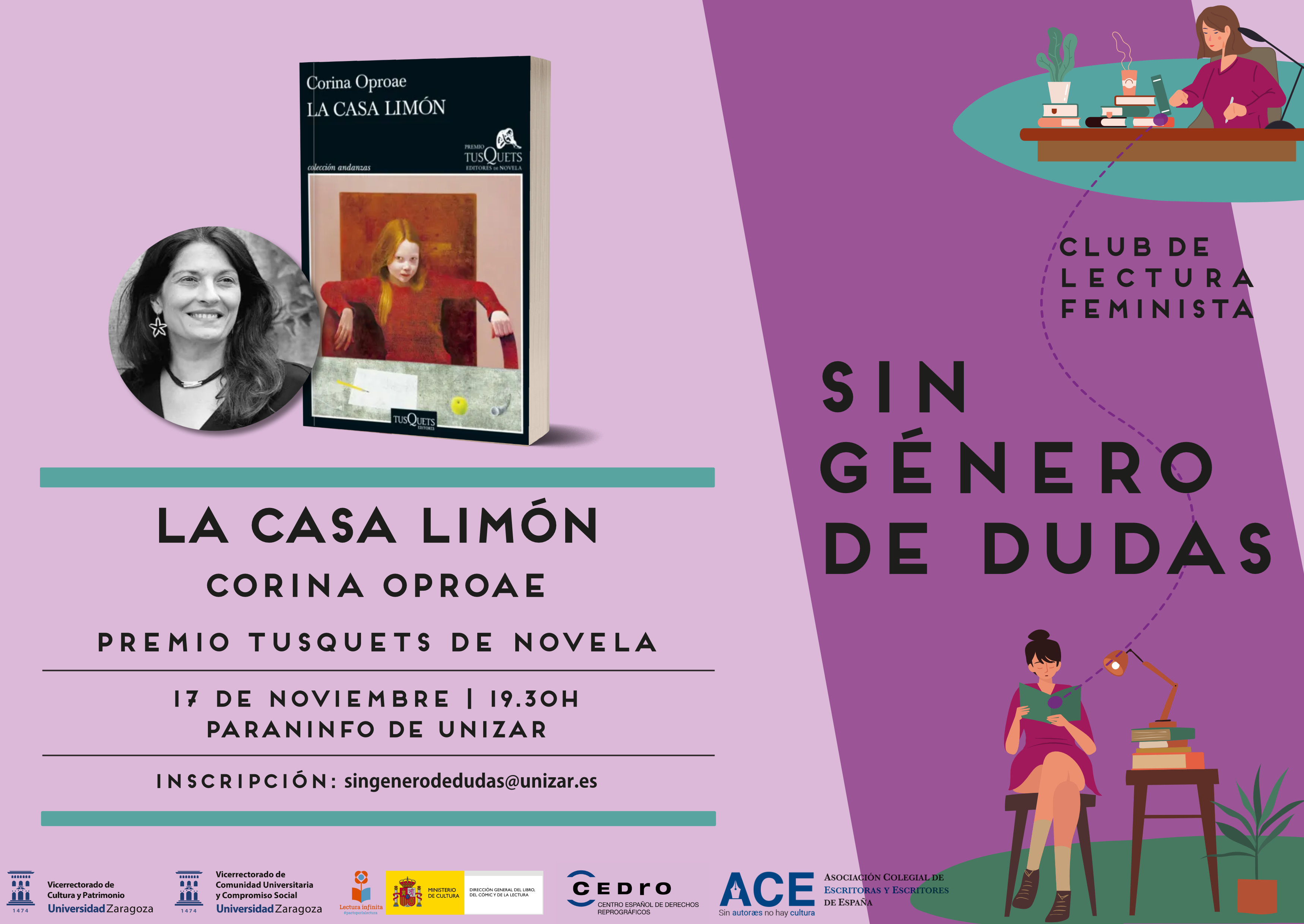 El lunes 17 de noviembre a las 19:30h se celebrará en el Aula Magna del Paraninfo de la Universidad de Zaragoza la sesión número 42 del club de lectura feminista. Nos acompañará la escritora Corina Oproae con la que conversaremos sobre su novela La casa limón.
