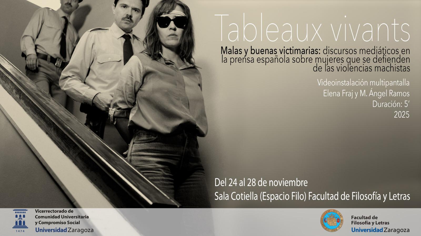 Además, del 24 al 28 de noviembre podrá verse la Videoinstalación multicanal (Tableaux Vivants) del proyecto "Malas y buenas victimarias: discursos mediáticos en la prensa española sobre mujeres que se defiende de las violencias machistas". Esta creación artística estará disponible en la Sala Cotiella, ubicada en el Espacio Filo de la Facultad de Filosofía y Letras.