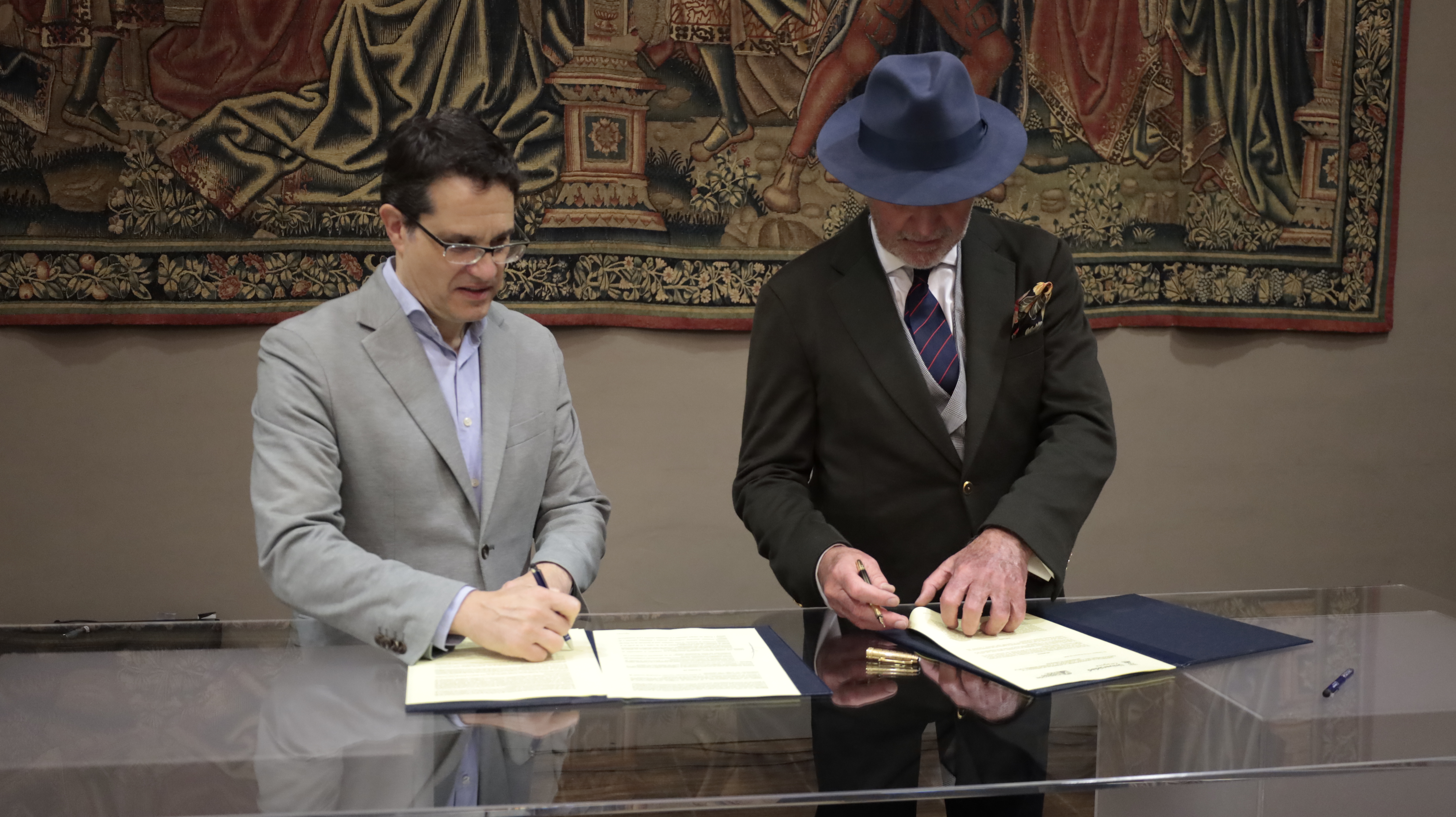 El vicerrector de Innovación, Transferencia y Formación Permanente de la Universidad de Zaragoza, Manuel González Bedia, y el presidente de la Fundación Ingenio Azul, Emilio Parra Gerona, han suscrito esta mañana en el Paraninfo el convenio de colaboración para la creación de esta cátedra.