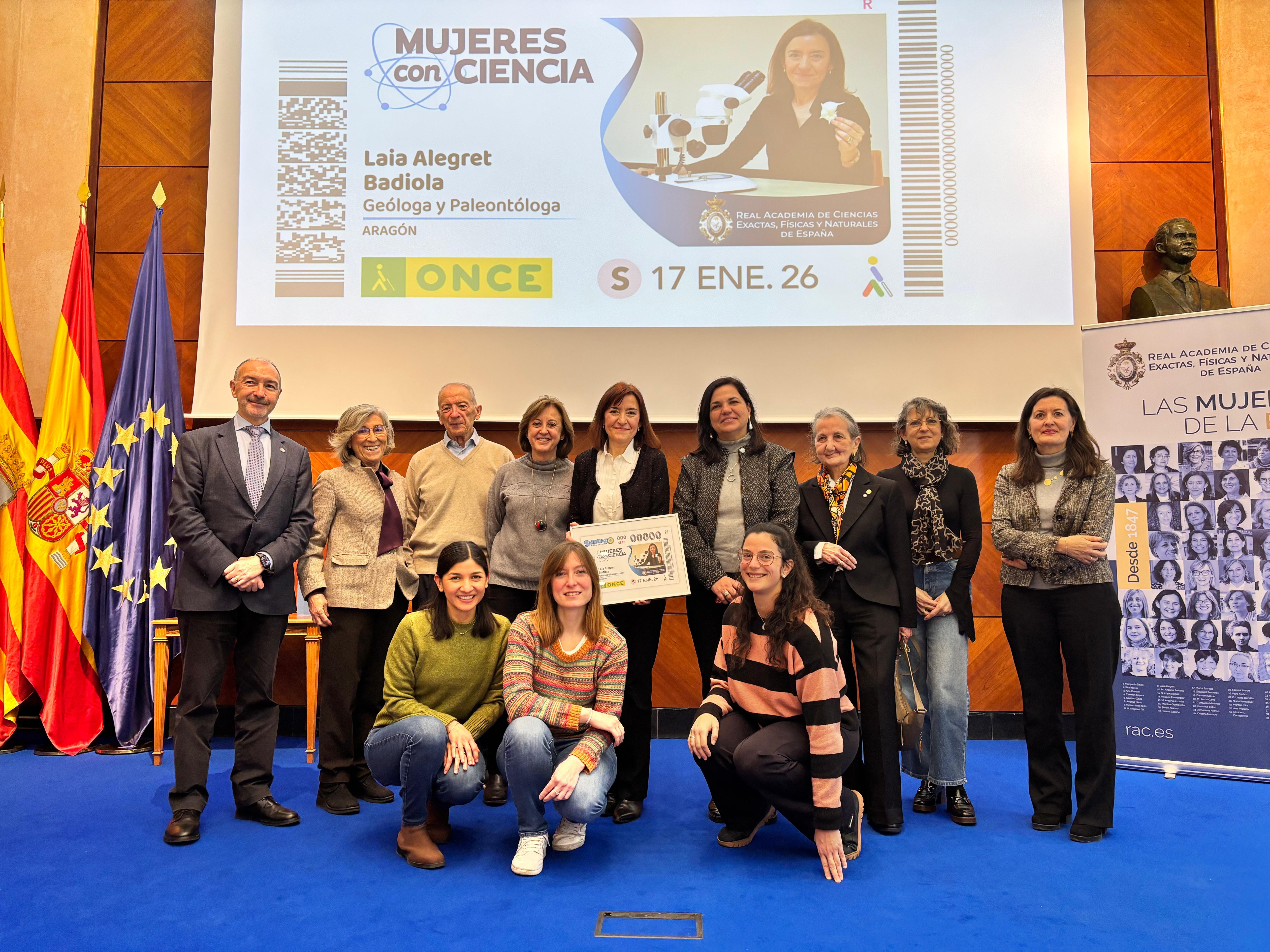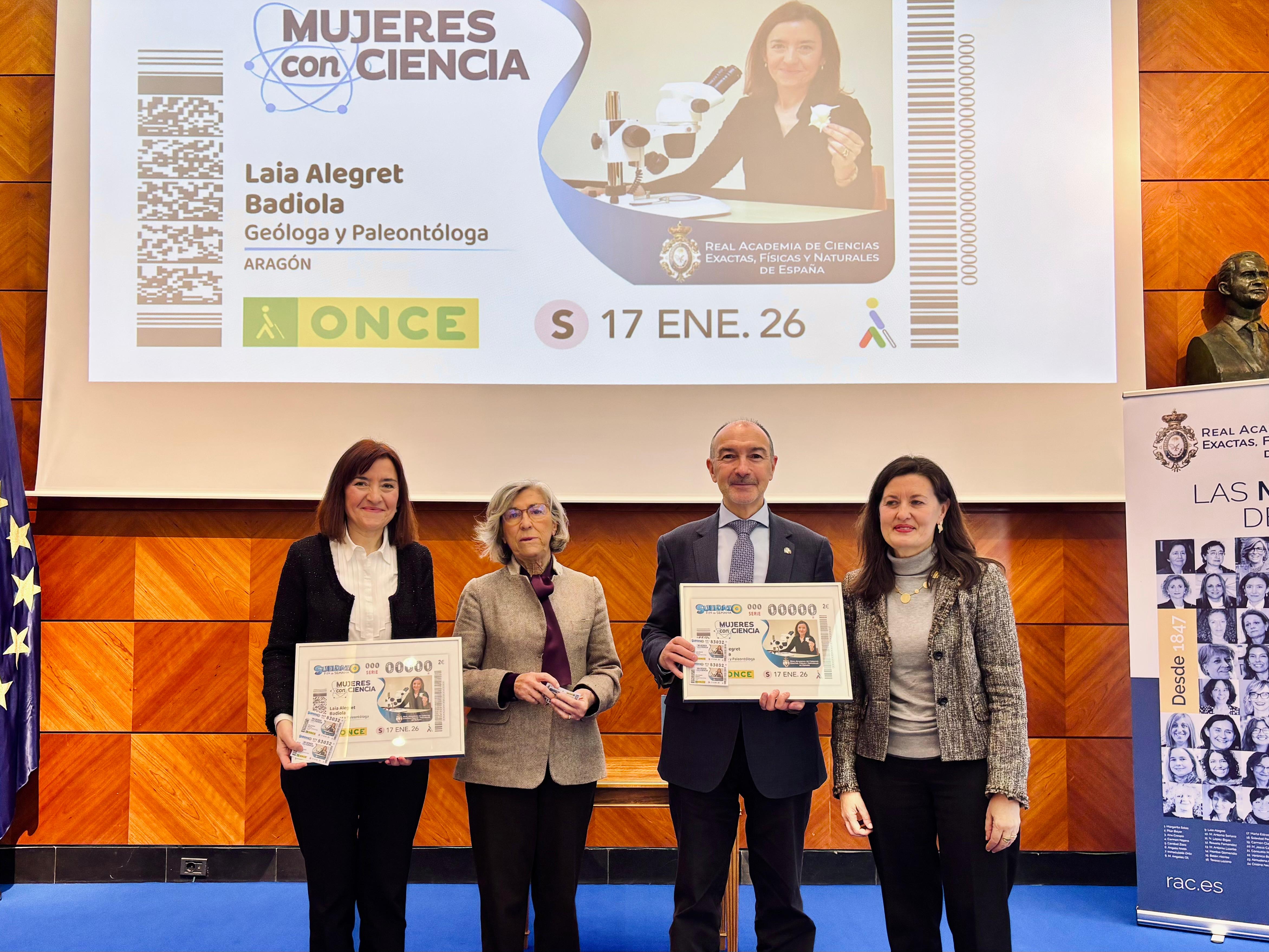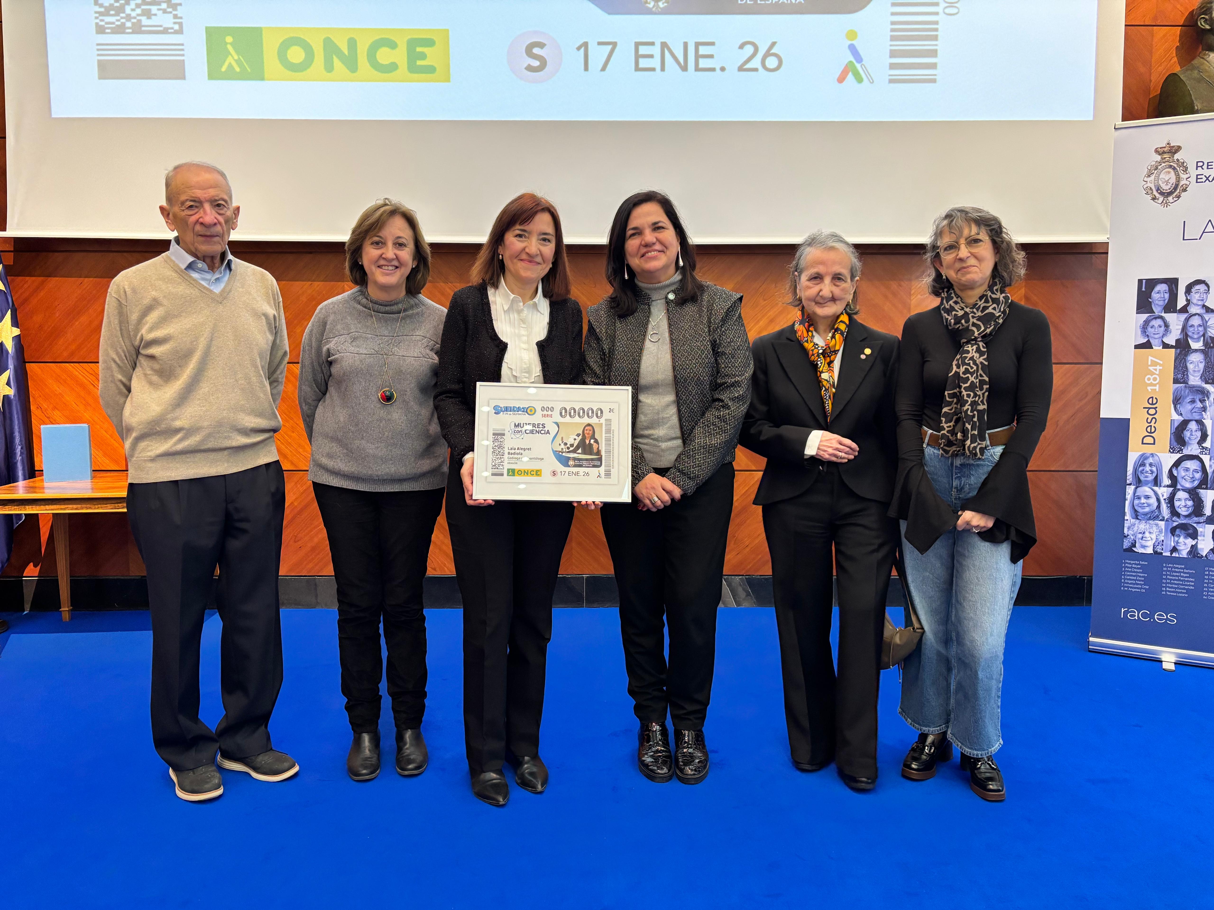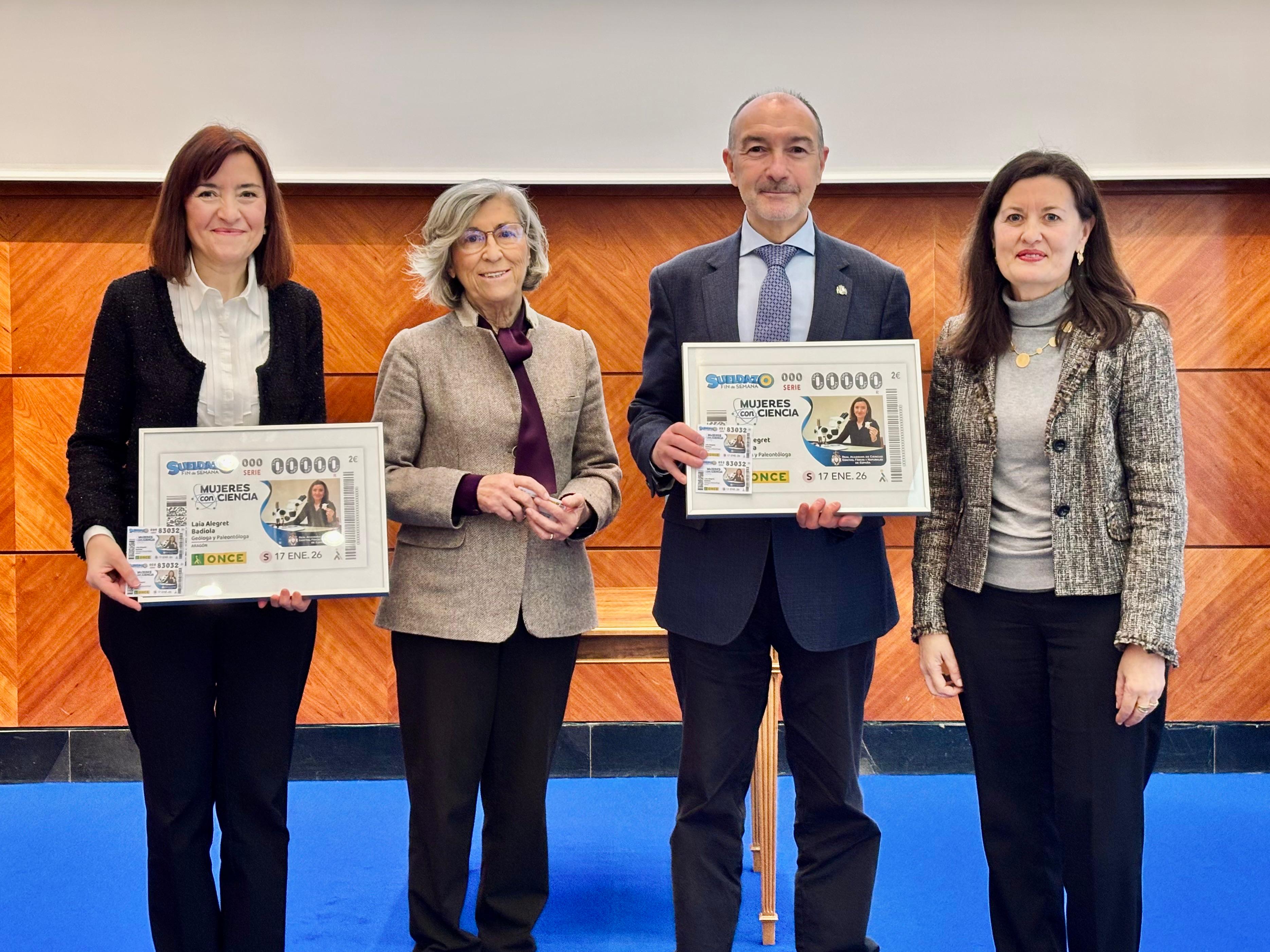 Fernando Beltrán, delegado del Gobierno de España en Aragón, y Raquel Pérez, delegada de la ONCE en Aragón, acompañados de Laia Alegret, catedrática de Paleontología de la Universidad de Zaragoza, Ana Crespo, presidenta de la Real Academia de Ciencias y José Luis Catalán, presidente del Consejo Territorial de la ONCE en Aragón, han presentado este cupón que llevará la imagen de la geóloga y paleontóloga oscense por toda España en cinco millones y medio de cupones. Por parte de la Universidad de Zaragoza le han acompañado entre otros, Carmen Marta, vicerrectora de Comunicación e Identidad Institucional, en representación de la rectora; Blanca Bauluz, decana de la Facultad de Ciencias, así como los académicos Luis Oro, María Teresa Lozano y María Luisa Sarsa, entre otros.