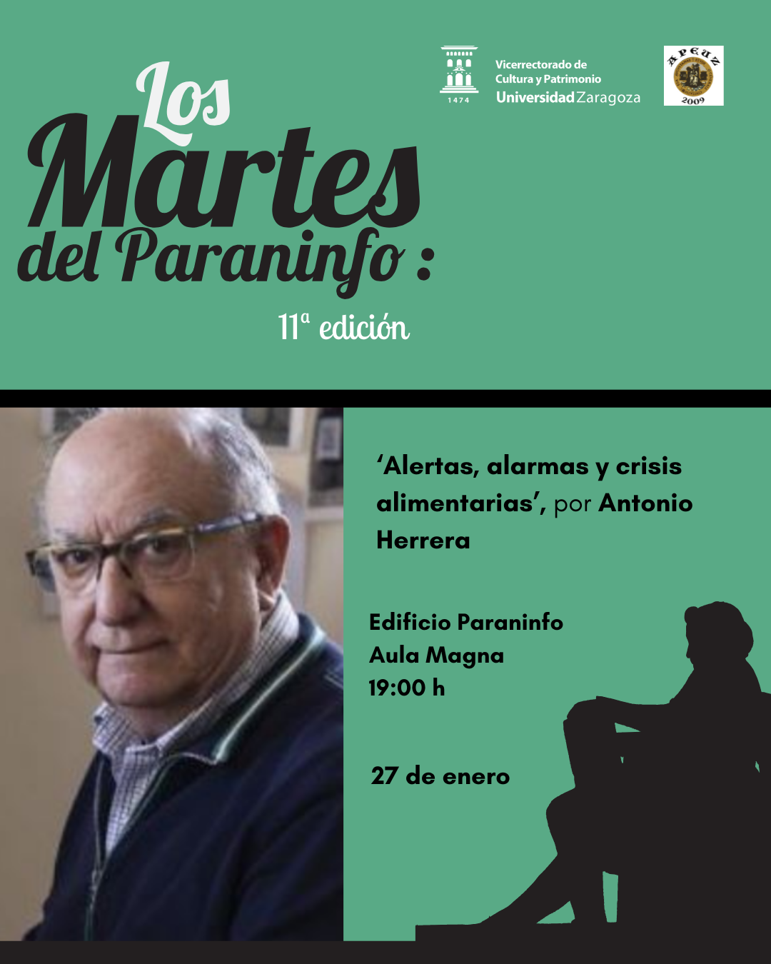 La conferencia titulada Alertas, alarmas y crisis alimentarias será impartida por el profesor emérito Antonio Herrera el día 27 de enero a las 19:00h en el Aula Magna del Paraninfo.