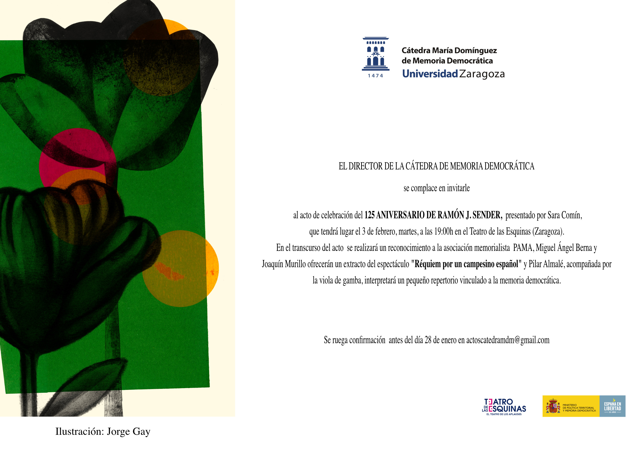 La Cátedra María Domínguez de Memoria Democrática celebrará un acto en el Teatro de las Esquinas (Zaragoza), el día 3 de febrero, a las 19:00 horas, con motivo del 125 aniversario del nacimiento de Ramón J. Sender, uno de los escritores aragoneses más relevantes y una figura imprescindible en la literatura y la memoria democrática del siglo XX.