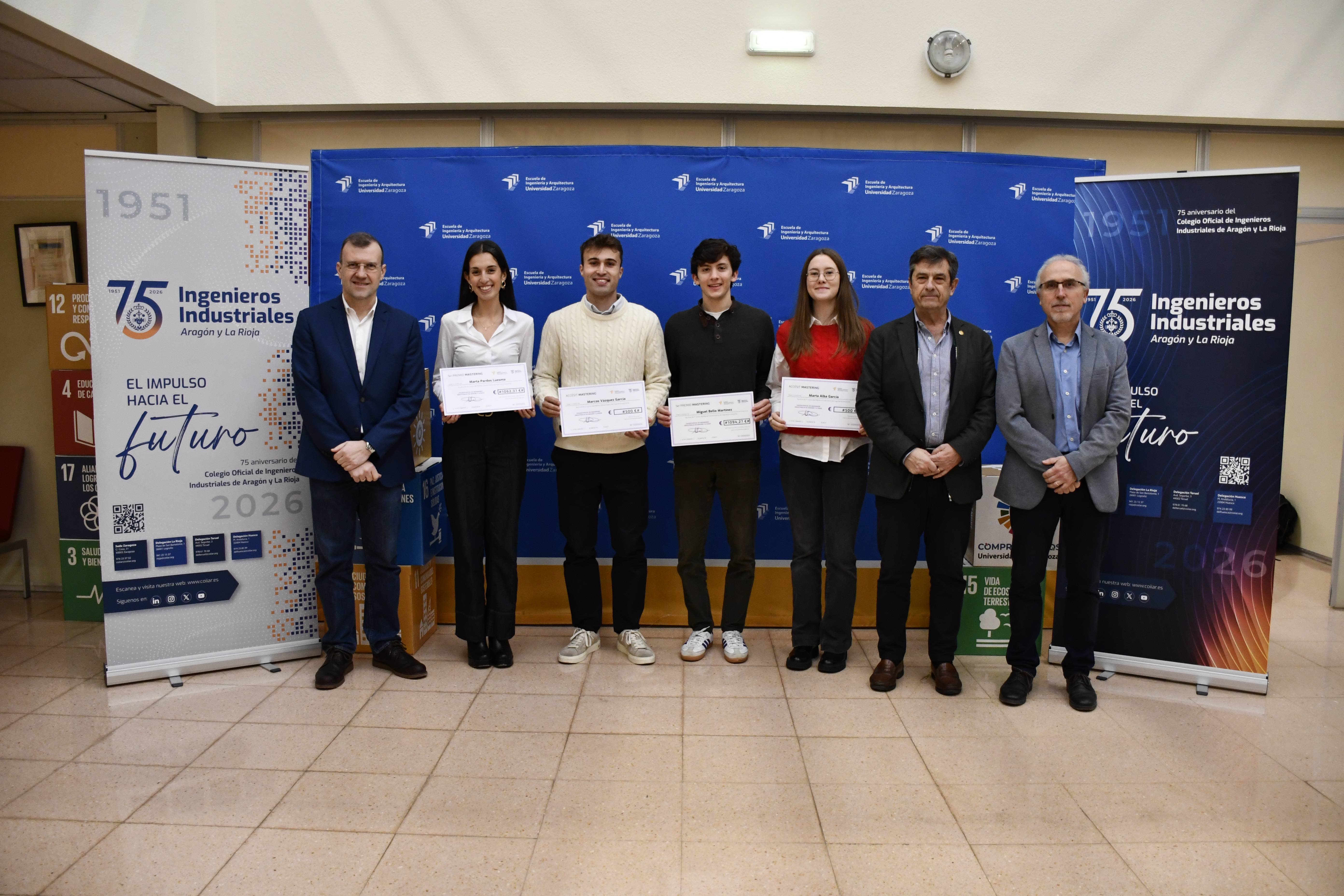 Los alumnos del Máster de Ingeniería Industrial de la Escuela de ingeniería y Arquitectura de la Universidad de Zaragoza, Marta Pardos Luesma y Miguel Bello Martínez han recibido el Premio MasterING 2026 que otorga el Colegio Oficial de Ingenieros Industriales de Aragón y La Rioja en la colaboración con la Universidad de Zaragoza. Cada uno ha recibido el importe equivalente de la matrícula en los dos cursos del Máster en Ingeniería Industrial. Además, han recibido un accésit al Premio, los alumnos, Marcos Vázquez García y Marta Alba García.