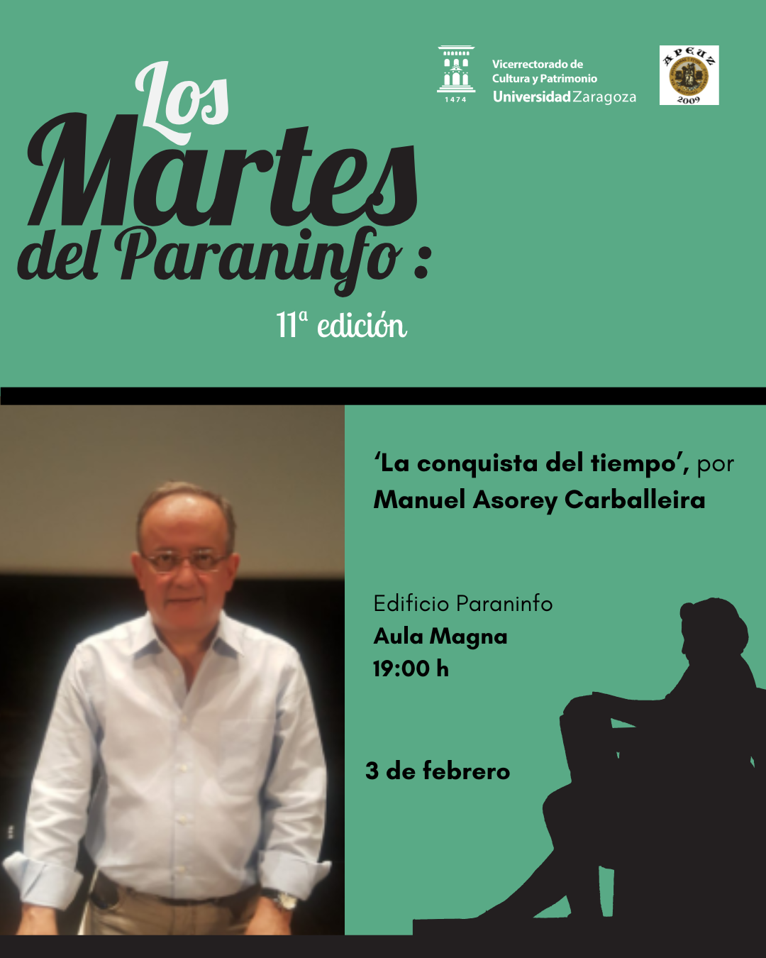 La conferencia titulada La conquista del tiempo será impartida por el profesor emérito Manuel Asorey el día 3 de febrero a las 19:00h en el Aula Magna del Paraninfo.