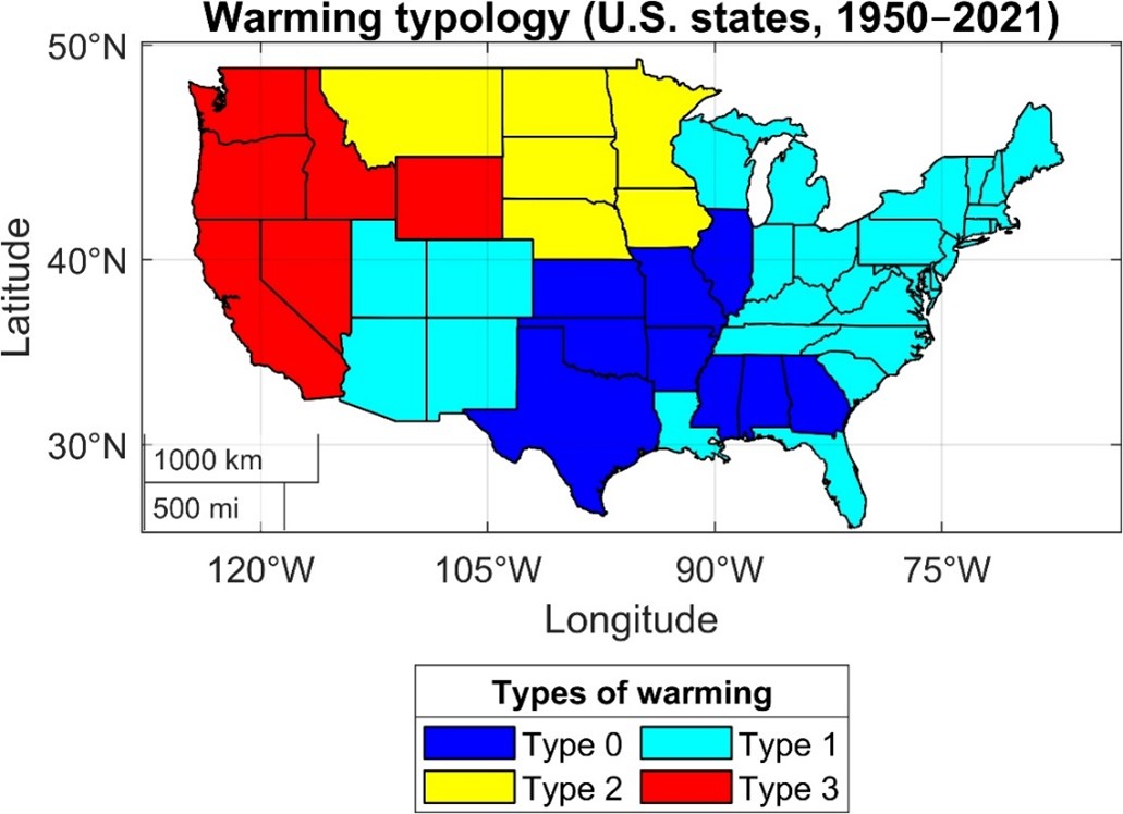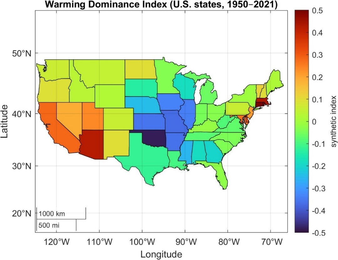 El cambio climático es un problema global, pero sus efectos pueden variar regionalmente, lo que exigiría estrategias de mitigación y de adaptación específicas en cada territorio y decisiones de políticas climáticas a nivel tanto global como local. Sin embargo, esta variabilidad climática rara vez se examina en detalle, a diferencia de otros temas relevantes para las políticas públicas, como la salud o el estatus económico. En este estudio, los autores proporcionan un marco para comparar las tendencias detalladas de temperatura en los 48 estados contiguos de EEUU (los continentales que se sitúan en el centro de América del Norte).