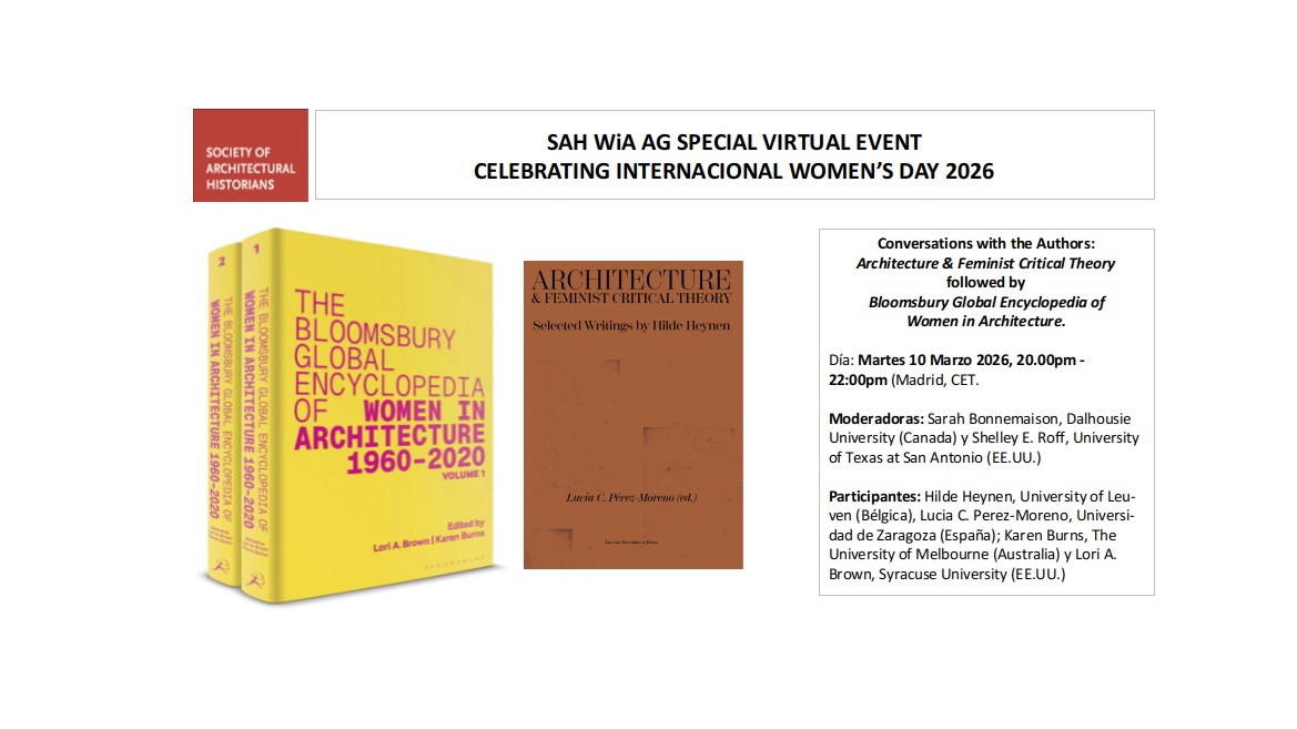 El evento, organizado por la SAH, es virtual (plataforma ZOOM) y gratuito; y se plantea como un diálogo entre la profesora Lucía C. Pérez-Moreno y la protagonista de su trabajo, la profesora Hilde Heynen. A ellas se suman las profesoras Karen Burns, The University of Melbourne (Australia) y Lori A. Brown (Syracuse University, U.S.) quienes también presentarán su último libro, la Bloomsbury Global Encyclopedia of Women in Architecture, en el que, además, la profesora Pérez-Moreno ha participado redactando biografías de arquitectas españolas.