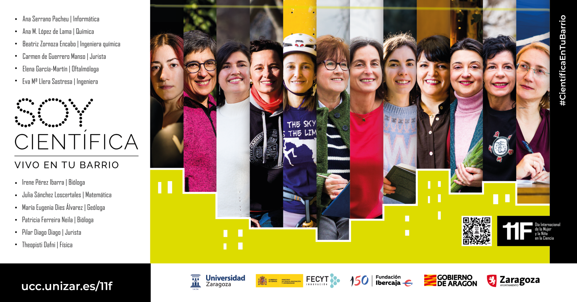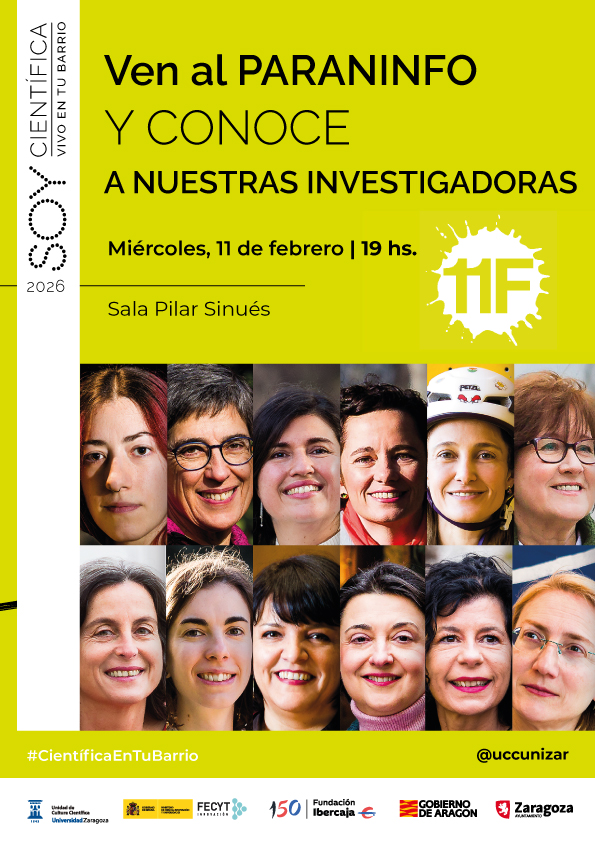 También este miércoles 11F a las 19:00h en la sala Pilar Sinués del Paraninfo tendrá lugar la conversación entre el público y las 11+1 científicas que participan en la VI campaña “Soy Científica. Vivo en tu barrio”, que durante todo el mes de febrero se puede visitar en la Gran Vía, ofreciendo referentes próximos “de carne y hueso” a la ciudadanía. Además, la exposición de Unizar, que cuenta con el apoyo del Ayuntamiento de Zaragoza, Gobierno de Aragón y Fundación Ibercaja, busca romper estereotipos contraproducentes, que presentan a las científicas como heroínas, frikis o con escasa vida social, lo que puede desmotivar a niñas y adolescentes, haciéndoles renunciar a su posible vocación científica. +INFO: https://ucc.unizar.es/11f