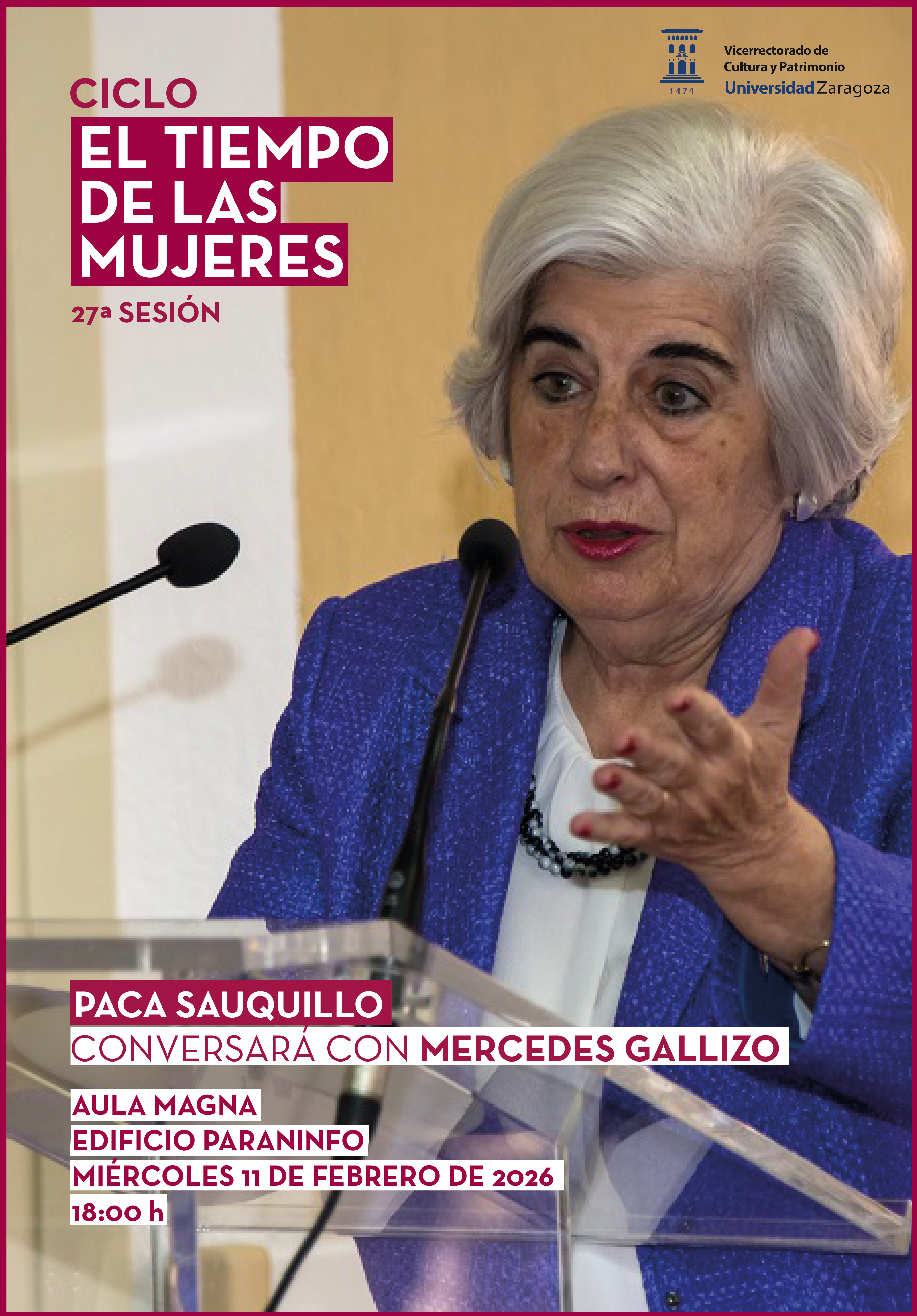 El miércoles 11 de febrero, a las 18:00h, en el Aula Magna del Paraninfo de la Universidad de Zaragoza, se celebrará la sesión 27 del ciclo 'El tiempo de las mujeres', con la presencia de dos mujeres políticas de gran relevancia, Paca Sauquillo y Mercedes Gallizo, que entrevistará a Sauquillo sobre su trayectoria.