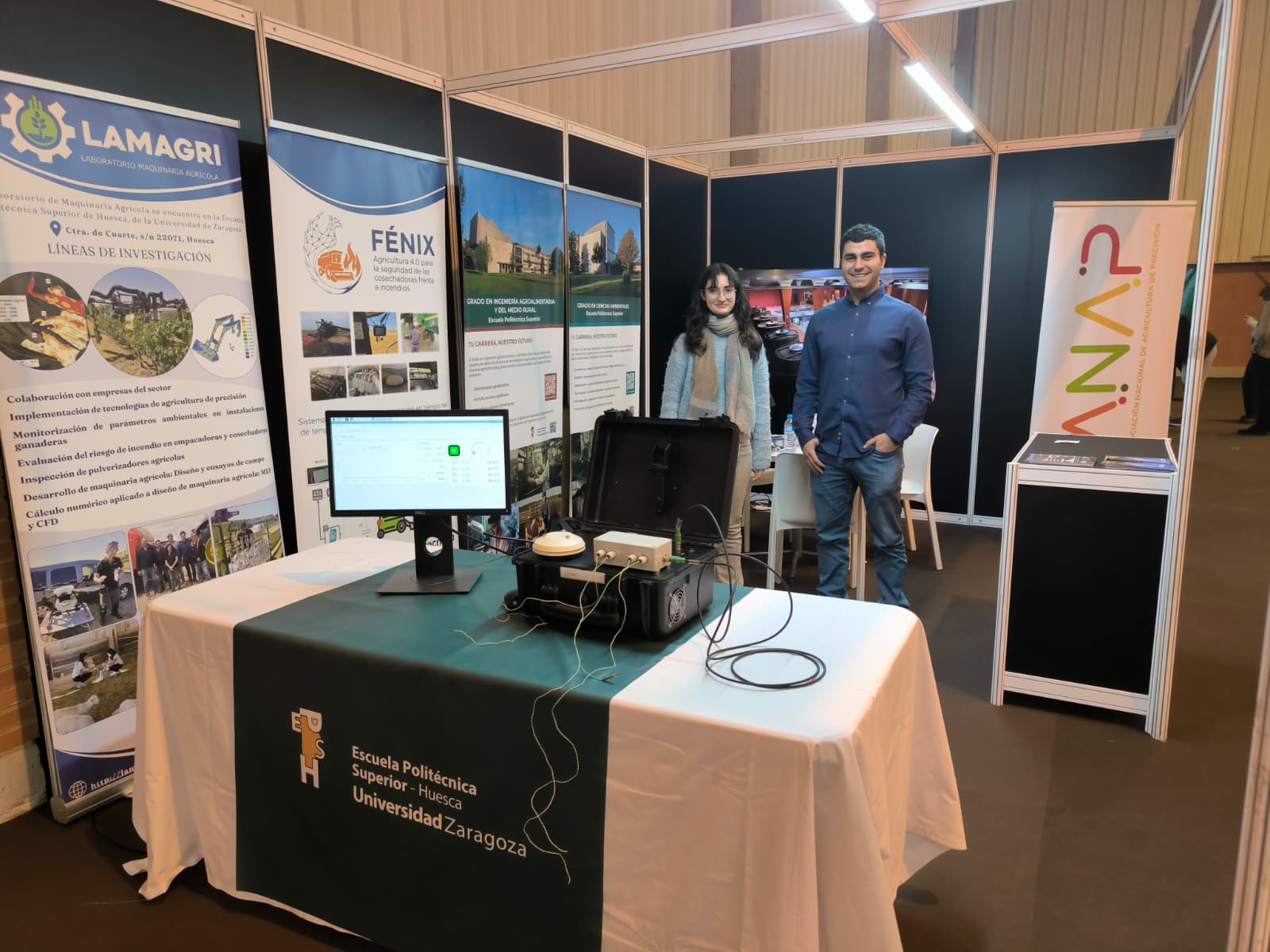 Un equipo formado por estudiantes de este centro explica a los visitantes la formación que reciben en el grado de Ingeniería Agroalimentaria y del Medio Rural, en el de Ciencias Ambientales y en el máster en Ingeniería Agronómica. En el mismo puesto de la Escuela oscense –situado en el espacio FimaTech de la Feria, dedicado a la innovación tecnológica y la digitalización del sector agrícola- se exponen dos demostradores de desarrollos realizados en el “campus verde” de Huesca. Se trata, por un lado, de un sistema de detección de la temperatura de mecanismos de cosechadoras, empacadoras y otras máquinas, destinado a evitar los conatos e incendios que se generan, con cierta frecuencia en verano, en las labores agrarias. Y también de sistema de pulverización electrostática que permite aplicar con precisión los fitosanitarios rociando ambas caras de las hojas de las plantas sometidas a este tratamiento.