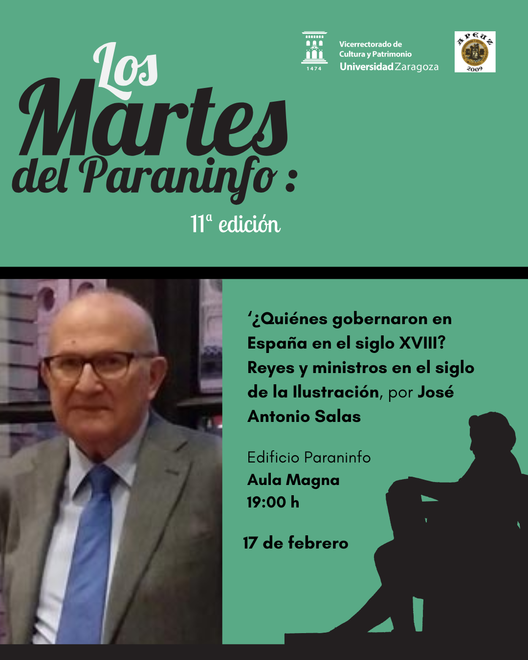 La conferencia titulada ¿Quiénes gobernaron en España en el siglo XVIII? Reyes y ministros en el siglo de la Ilustración será impartida por el profesor emérito de Historia Moderna José Antonio Salas el día 17 de febrero a las 19:00h en el Aula Magna del Paraninfo.