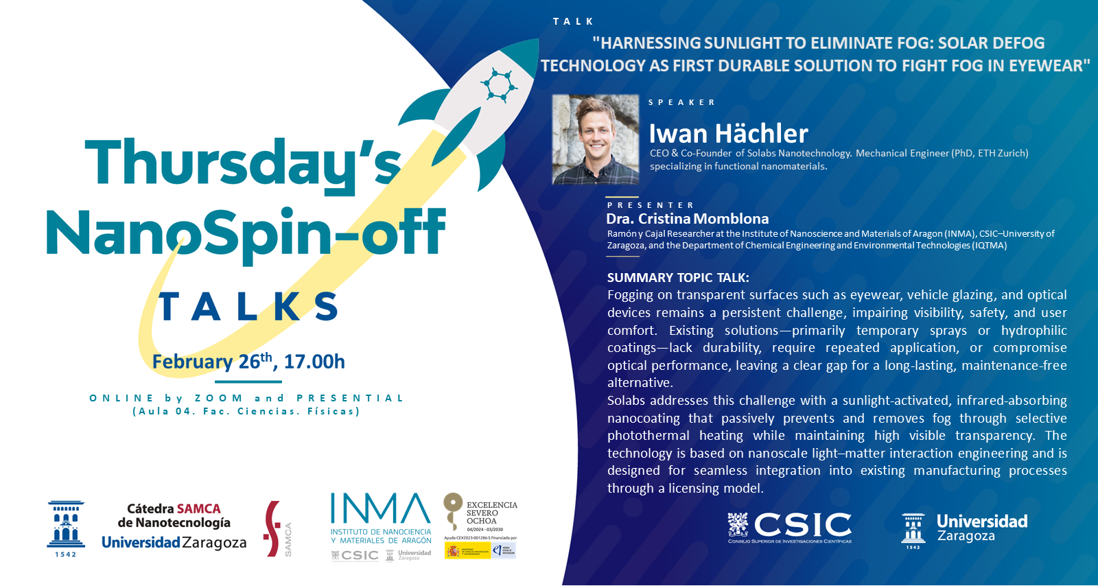 El 26 de febrero a las 17.00h se llevará a cabo en el ciclo de charlas de la Cátedra SAMCA de Nanotecnología “Thursday´s NanoSpin-off Talks”, la charla "HARNESSING SUNLIGHT TO ELIMINATE FOG: SOLAR DEFOG TECHNOLOGY AS FIRST DURABLE SOLUTION TO FIGHT FOG IN EYEWEAR"