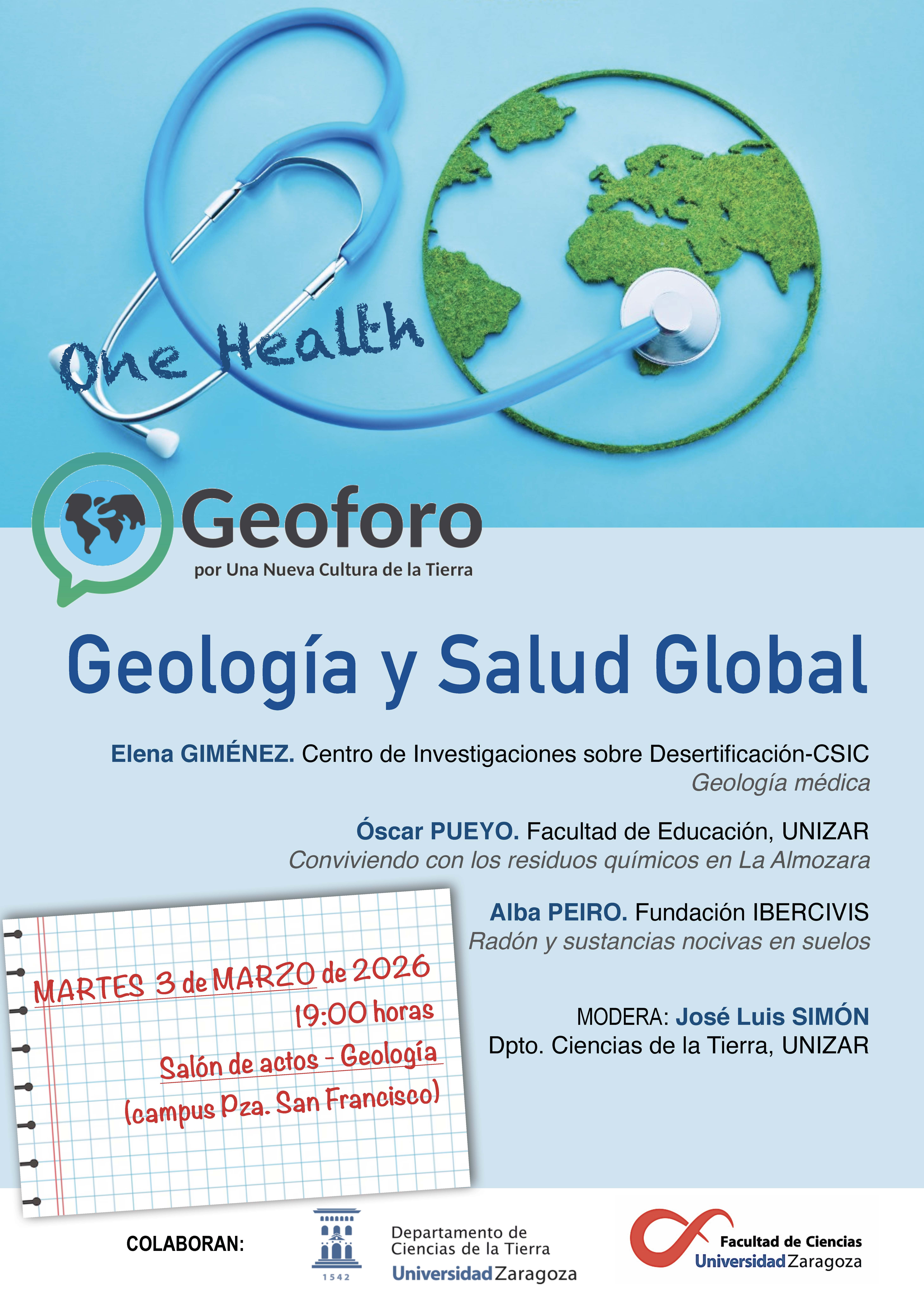 El próximo martes 3 de marzo de 2026, a las 19:00 horas, el Salón de Actos del Ed. Geología de la Facultad de Ciencias (Campus Plaza San Francisco, Universidad de Zaragoza) acogerá la jornada “Geología y Salud Global”, en el marco de Geoforo por una Nueva Cultura de la Tierra. Bajo el enfoque One Health, que integra la salud humana, ambiental y animal, esta sesión propone una reflexión sobre cómo los procesos geológicos y ambientales influyen directamente en la salud de las personas y los ecosistemas.