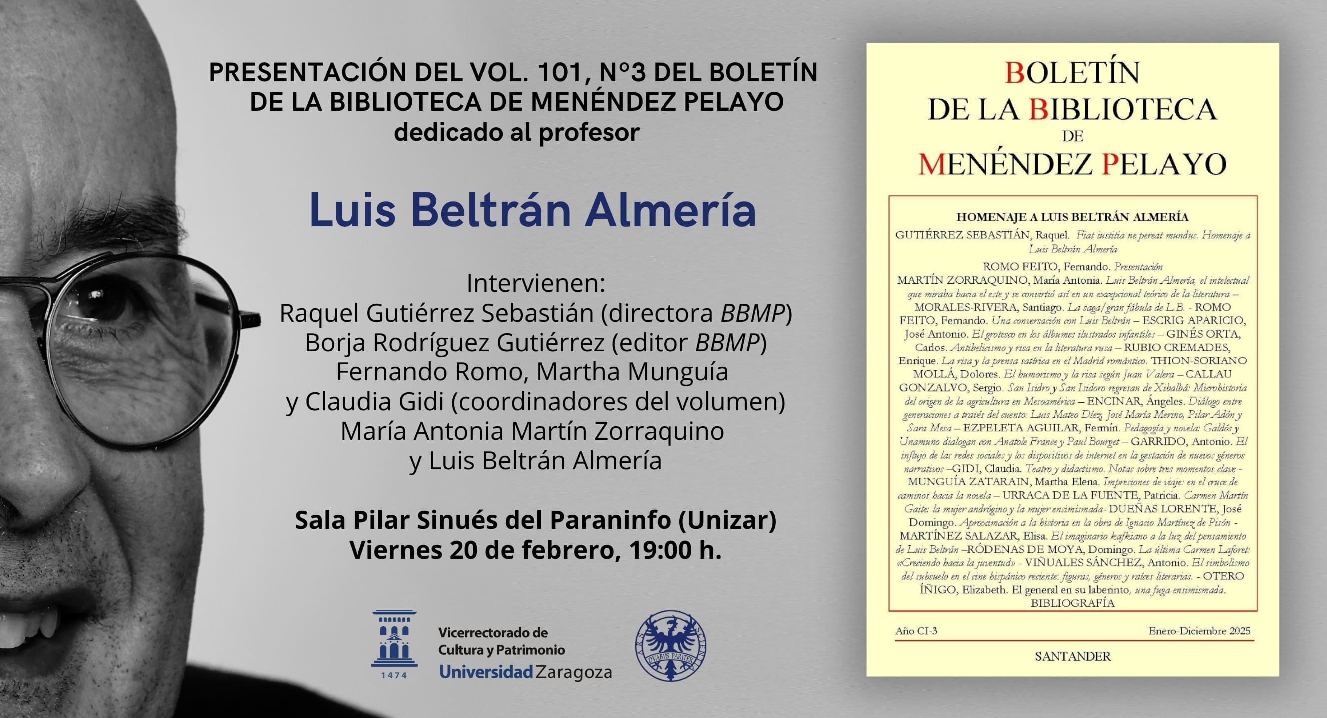 El viernes 20 de febrero se presenta en el Paraninfo de la Universidad de Zaragoza el número Homenaje a Luis Beltrán Almería del Boletín de la Biblioteca de Menéndez Pelayo. En el acto, organizada por el Vicerrectorado de Cultura y Patrimonio en colaboración con la Biblioteca de Menéndez Pelayo, intervendrán Raquel Gutiérrez Sebastián y Borja Rodríguez Gutiérrez, directora y editor del Boletín de la Biblioteca de Menéndez Pelayo; los coordinadores del número, Fernando Romo, Marta Munguía y Claudia Gidi; María Antonia Martín Zorraquino, catedrática emérita de Lengua Española, y el propio Luis Beltrán, catedrático de Teoría literaria y Literatura comparada de la Universidad de Zaragoza, recientemente jubilado. Una ocasión para acompañarle y celebrar su trayectoria.