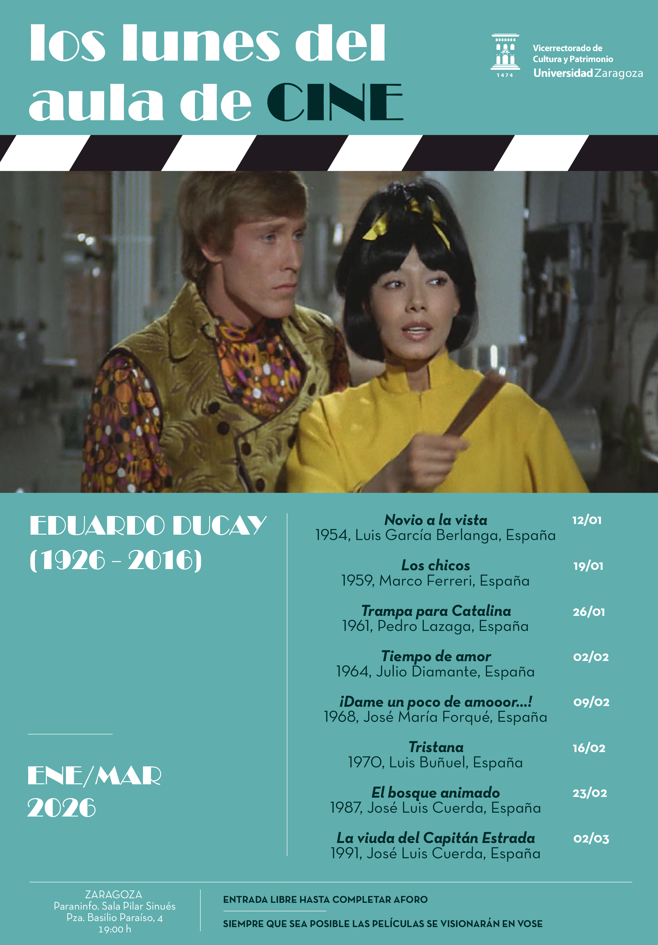 Esta tarde, a las 19:00h en la sala Pilar Sinués del edificio Paraninfo, se proyectará la película La viuda del Capitán Estrada, dirigida por José Luis Cuerda. Con esta sesión concluye el ciclo de 'Aula de cine' dedicado al zaragozano Eduardo Ducay.