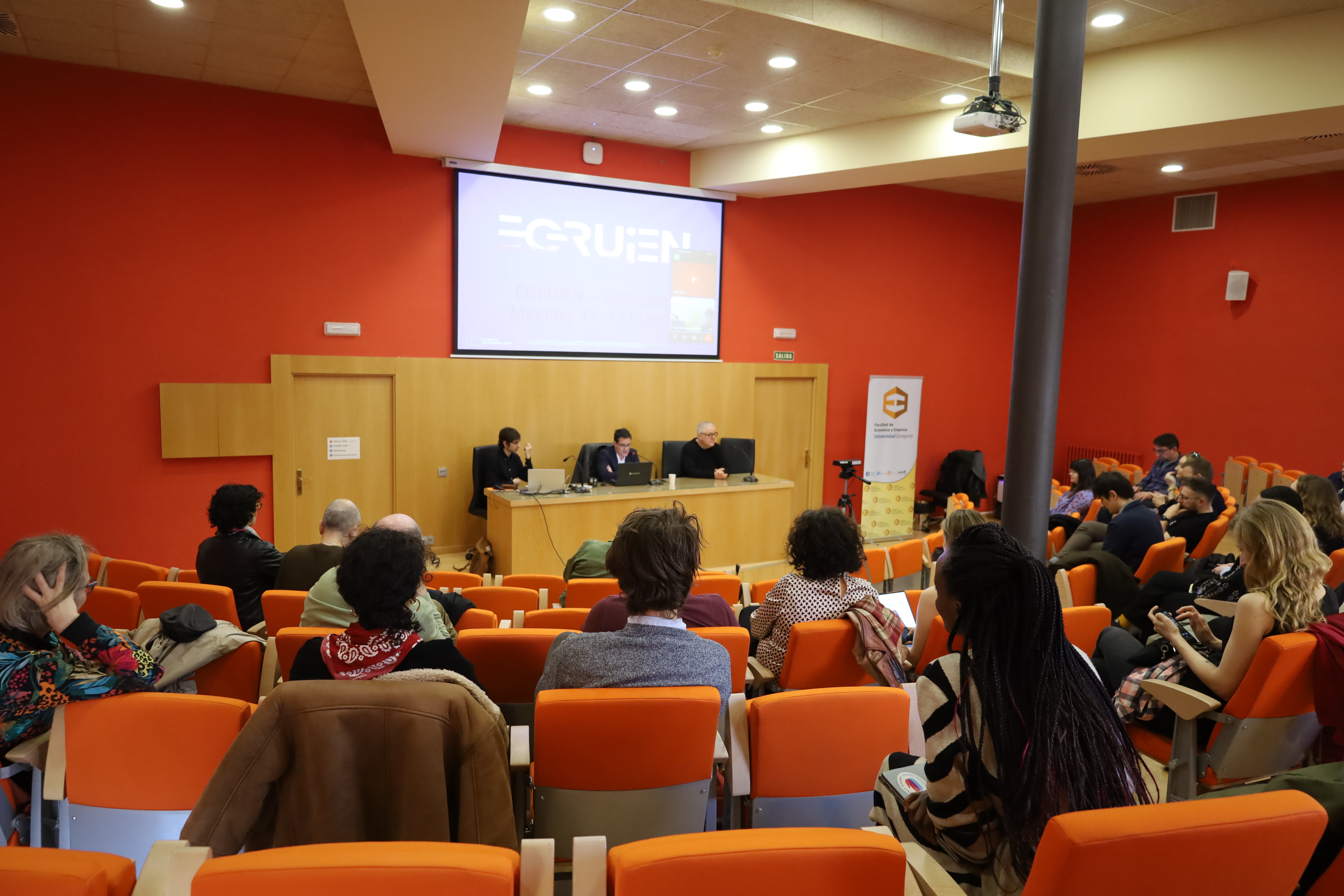 Financiado por el programa Horizonte Europa, EGRUiEN analiza cómo los mecanismos de negociación y diálogo social entre agentes sociales y poderes públicos pueden ayudar a garantizar transiciones laborales justas en sectores como la automoción, la energía, el transporte a demanda o los cuidados. La jornada de este miércoles está dedicada a los sectores de automoción y energía, con la presentación de casos nacionales de los nueve países, una discusión comparativa y un debate sobre los enfoques analíticos comunes del proyecto. En la de mañana jueves se abordarán los protocolos de investigación del transporte a demanda y del sector de cuidados, la metodología para el estudio del diálogo social a escala de la UE, y cuestiones de planificación futura. Las jornadas se cerrarán con la visita a la exposición fotográfica "Riders", sobre las condiciones de trabajo de los repartidores de plataformas, alojada en la Facultad de Economía y Empresa.