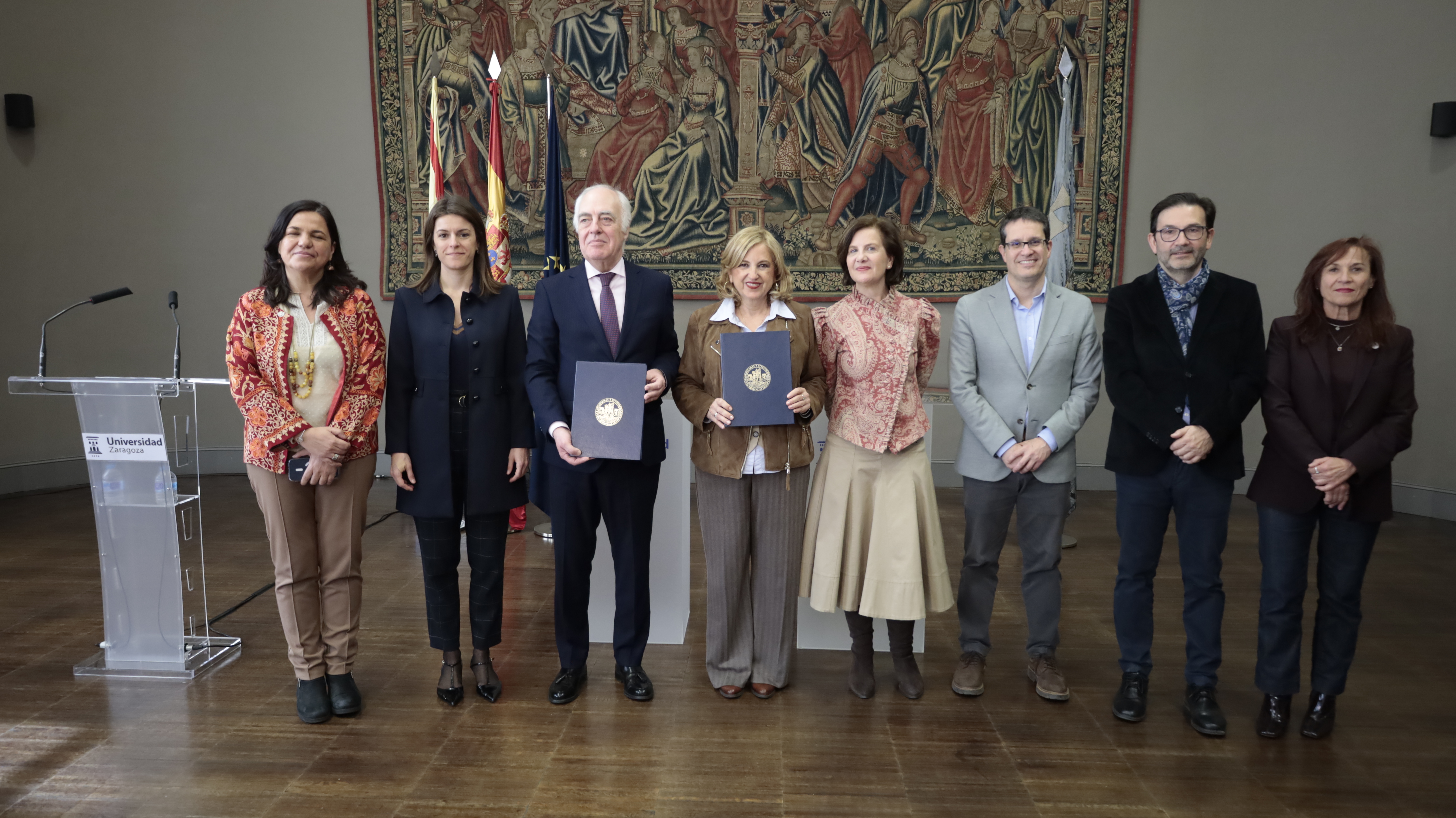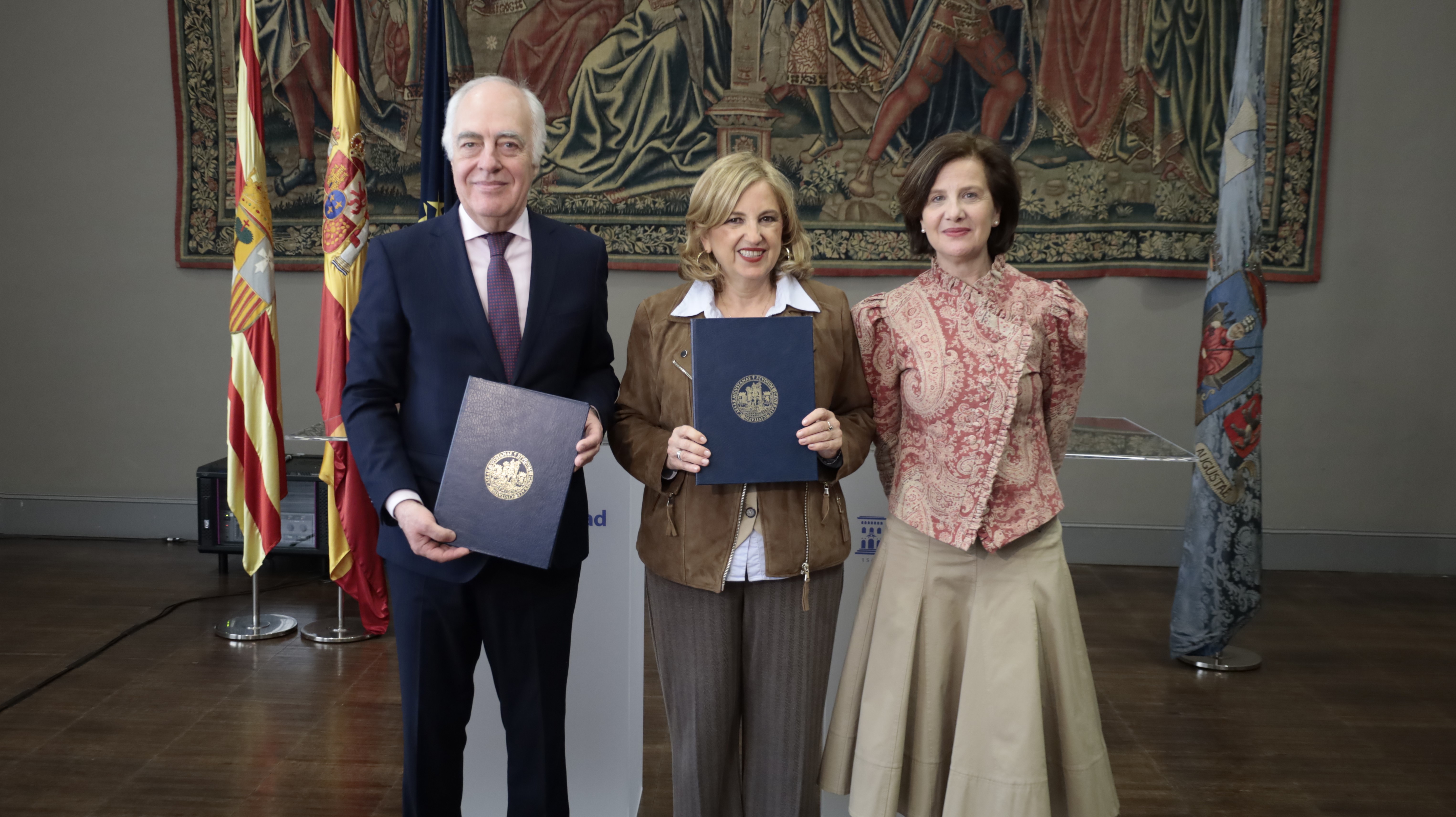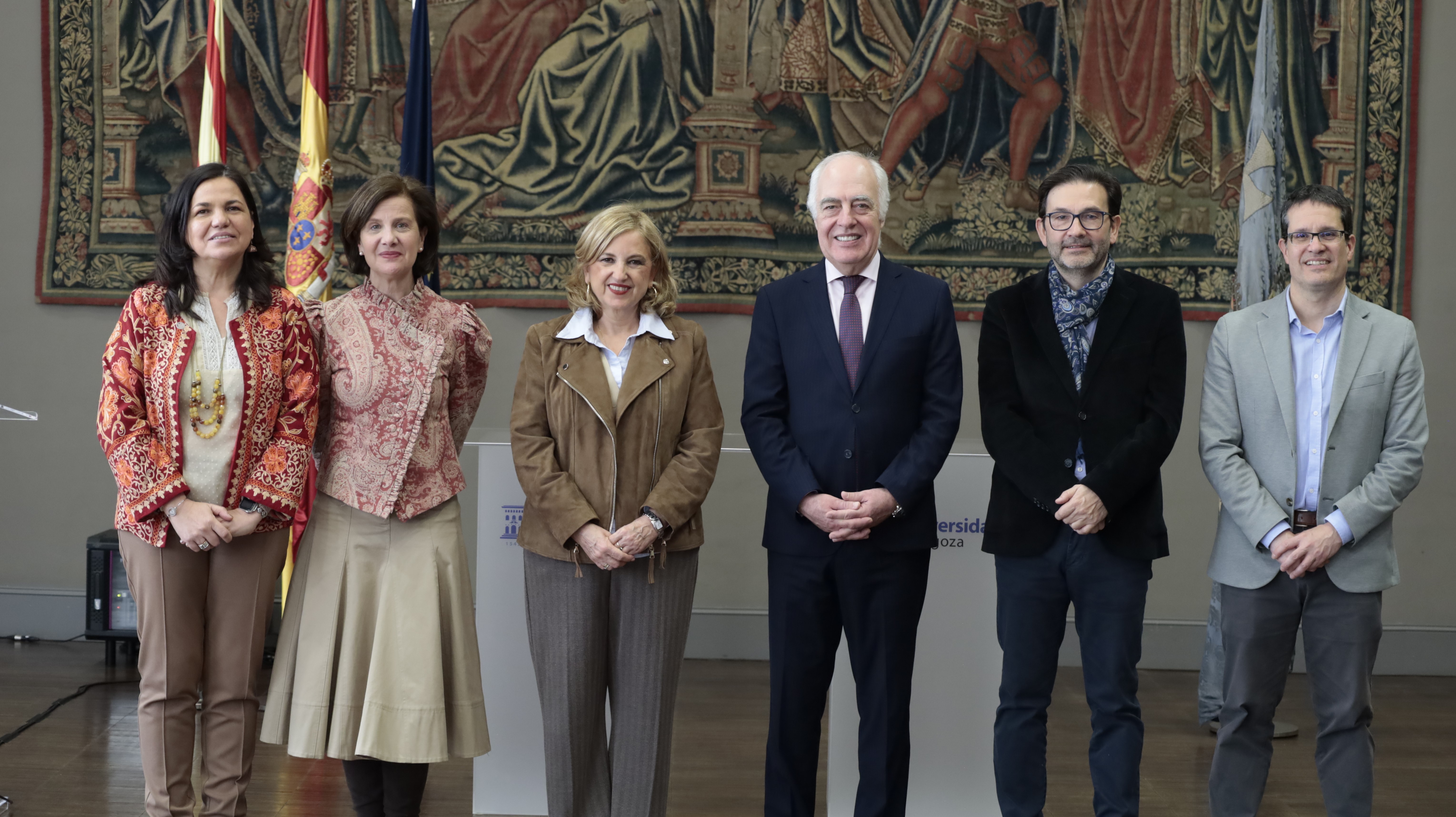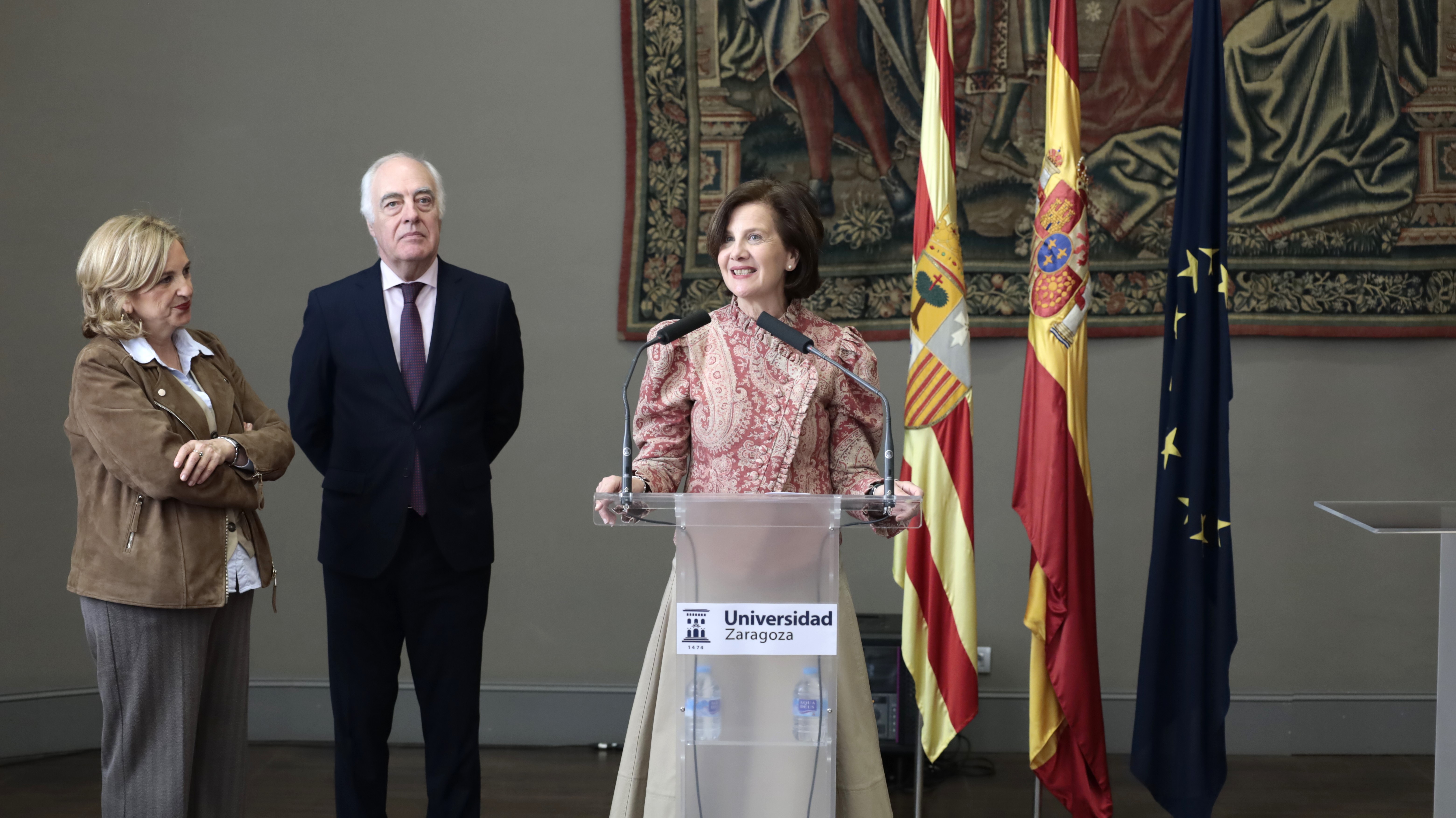 La presentación de la cátedra ha tenido lugar hoy en la sala Amar y Borbón del Paraninfo de la Universidad de Zaragoza, y ha contado con las intervenciones de la rectora de la Universidad de Zaragoza, Rosa Bolea; el director general de la Fundación Ibercaja, José Luis Rodrigo; y la directora de la cátedra, la profesora de la Facultad de Derecho de la Universidad de Zaragoza, Aurora López.