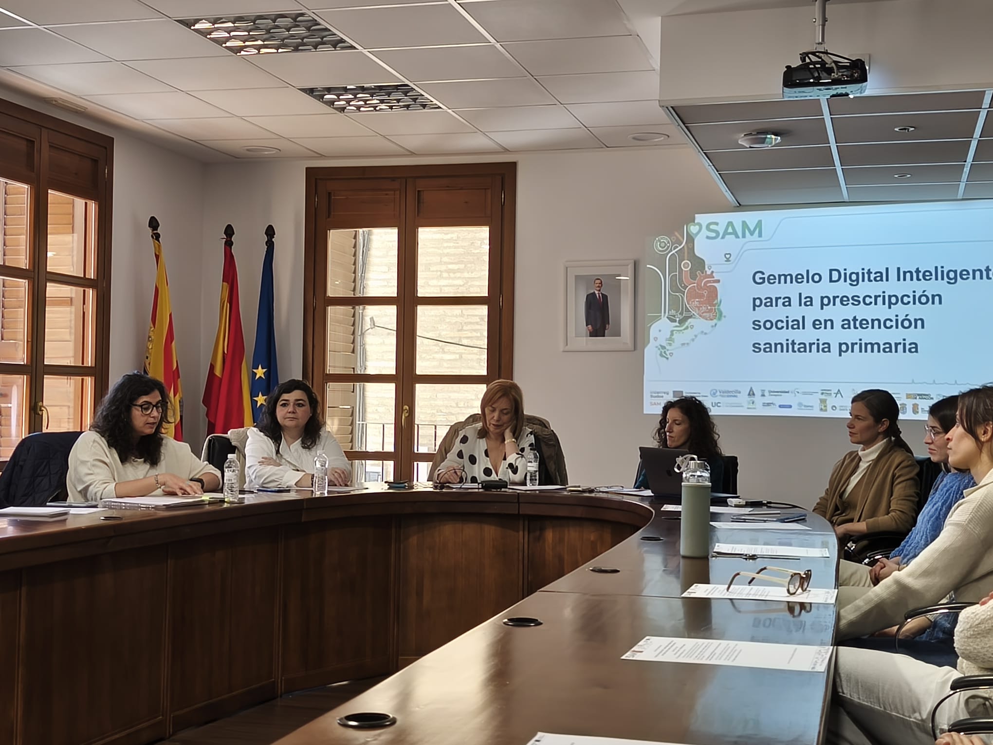 - Momento de la presentación del Proyecto SAM, de izquierda a derecha: Raquel Llera, Directora de Atención Primaria del Sector Zaragoza III; Silvia Martínez, Dirección General Salud Pública; Mª Luz Lou Dirección General Asistencia Sanitaria y Planificación; Belén Benedé, Coordinadora de la Estrategia de Salud Comunitaria de Aragón; Isabel Arnas, Subdirectora de la Gerencia Única de Atención Primaria, Nuria Gayan, Directora General de Salud Pública de Gobierno de Aragón, María Pilar Echeverría, directora de Servicios Sociales de la comarca Campo de Borja, María Zúñiga, Dpto. Geografía y Ordenación del Territorio, IUCA e investigadora principal del proyecto en Universidad de Zaragoza, Carmen Bentué, Dpto. Geografía y Ordenación del Territorio, IUCA e investigadora Postdoctoral en la Universidad de Zaragoza y Emilia Vargas, Investigadora Principal del proyecto en el Instituto de Investigación Sanitaria Aragón (IIS Aragón).