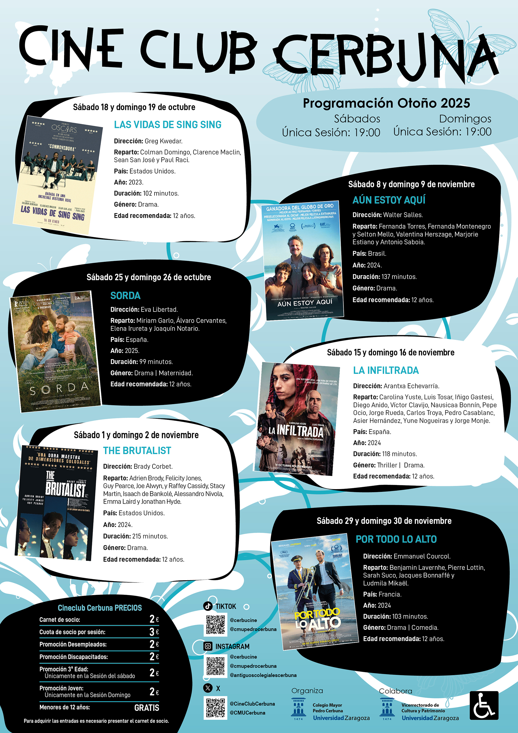 Las entradas para el Cineclub Cerbuna se adquieren exclusivamente en la taquilla, previa presentación del carné de socio. Este se puede adquirir los mismos días de las proyecciones con un coste de dos euros, válido para todo el curso. Además, el Cineclub continúa apostando por la cultura al alcance de todos con una entrada reducida de dos euros destinada a personas jubiladas (los sábados), jóvenes menores de 30 años (los domingos), personas en situación de desempleo, personas con discapacidad y niños menores de 12 años que podrán disfrutar gratuitamente de las proyecciones, que tienen lugar los sábados y domingos a las 19:00 horas en el teatro del Colegio Mayor Pedro Cerbuna.
