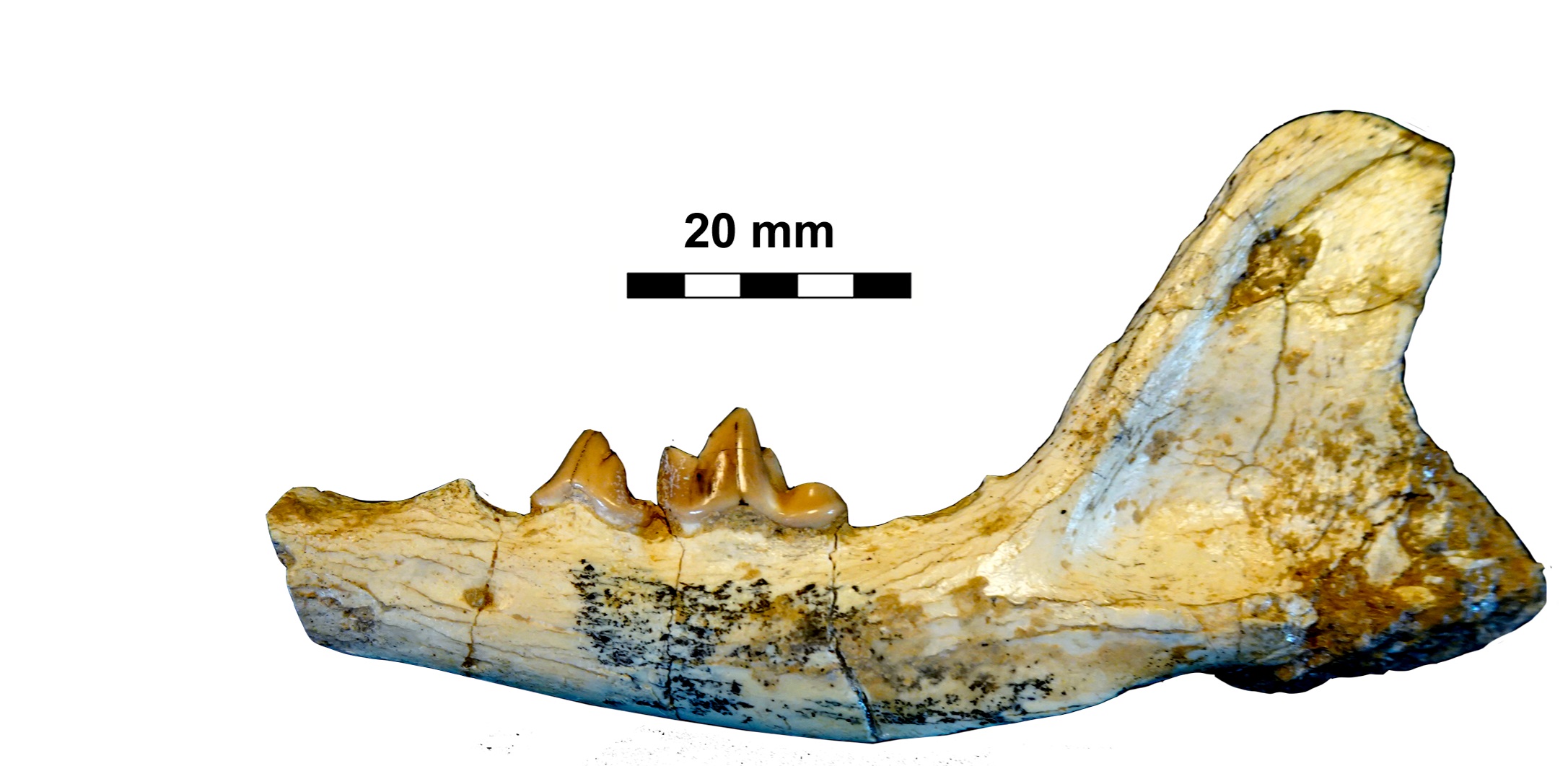 - Hemimandíbula izquierda de Magerictis imperialensis procedente de Príncipe Pío-2 (Madrid, España), en vista lingual, con p4–m1 completos y alvéolos para p3 y m2.