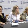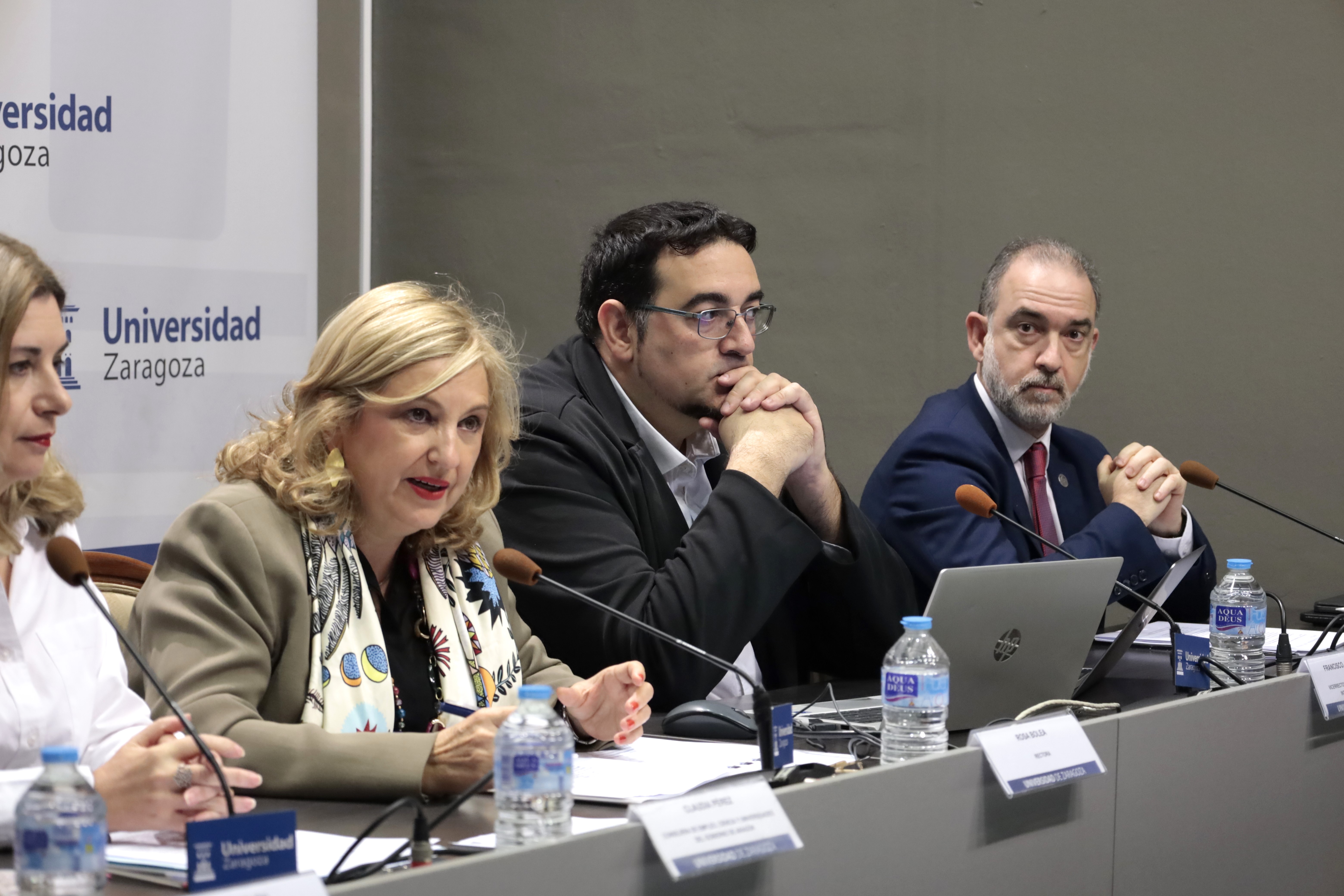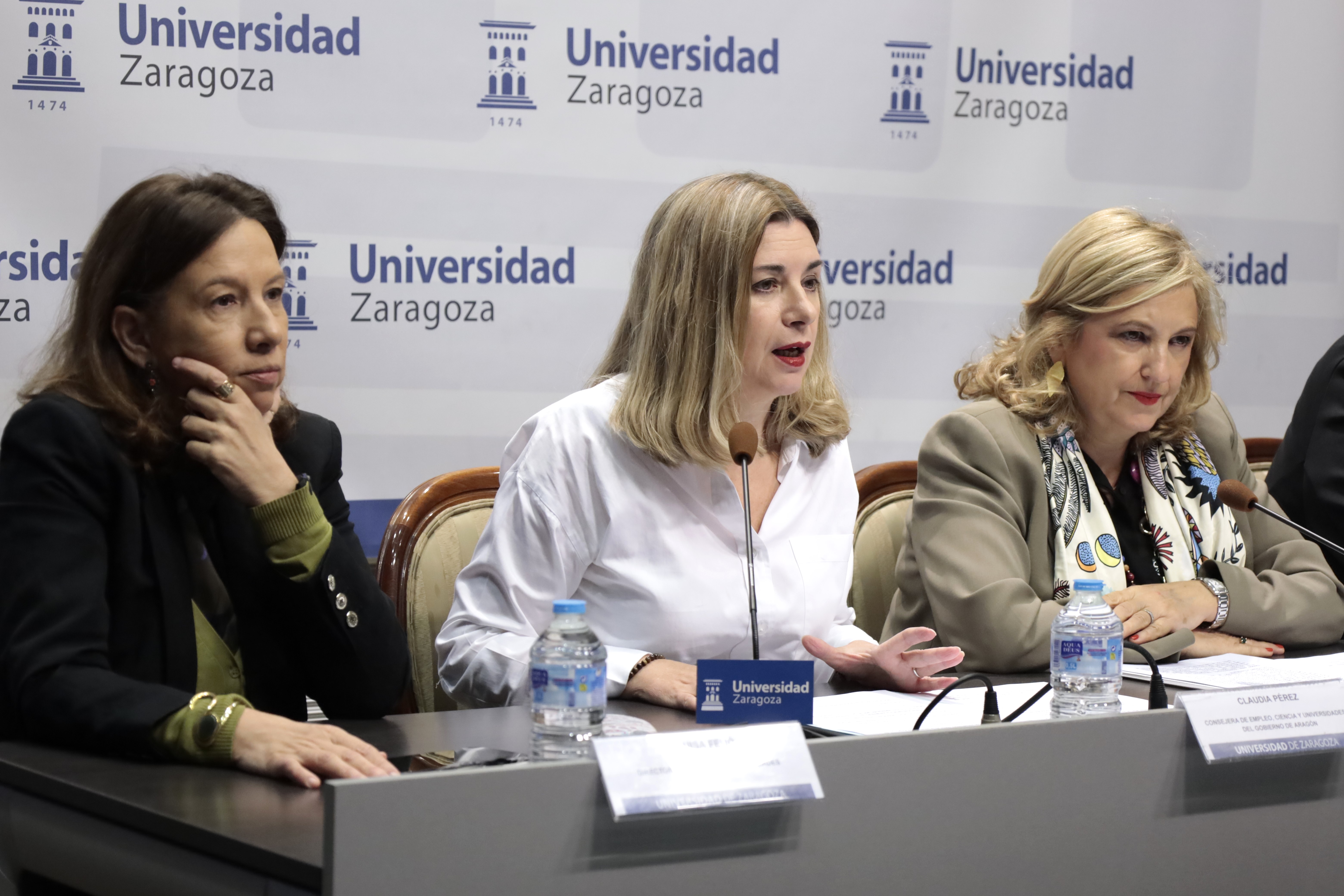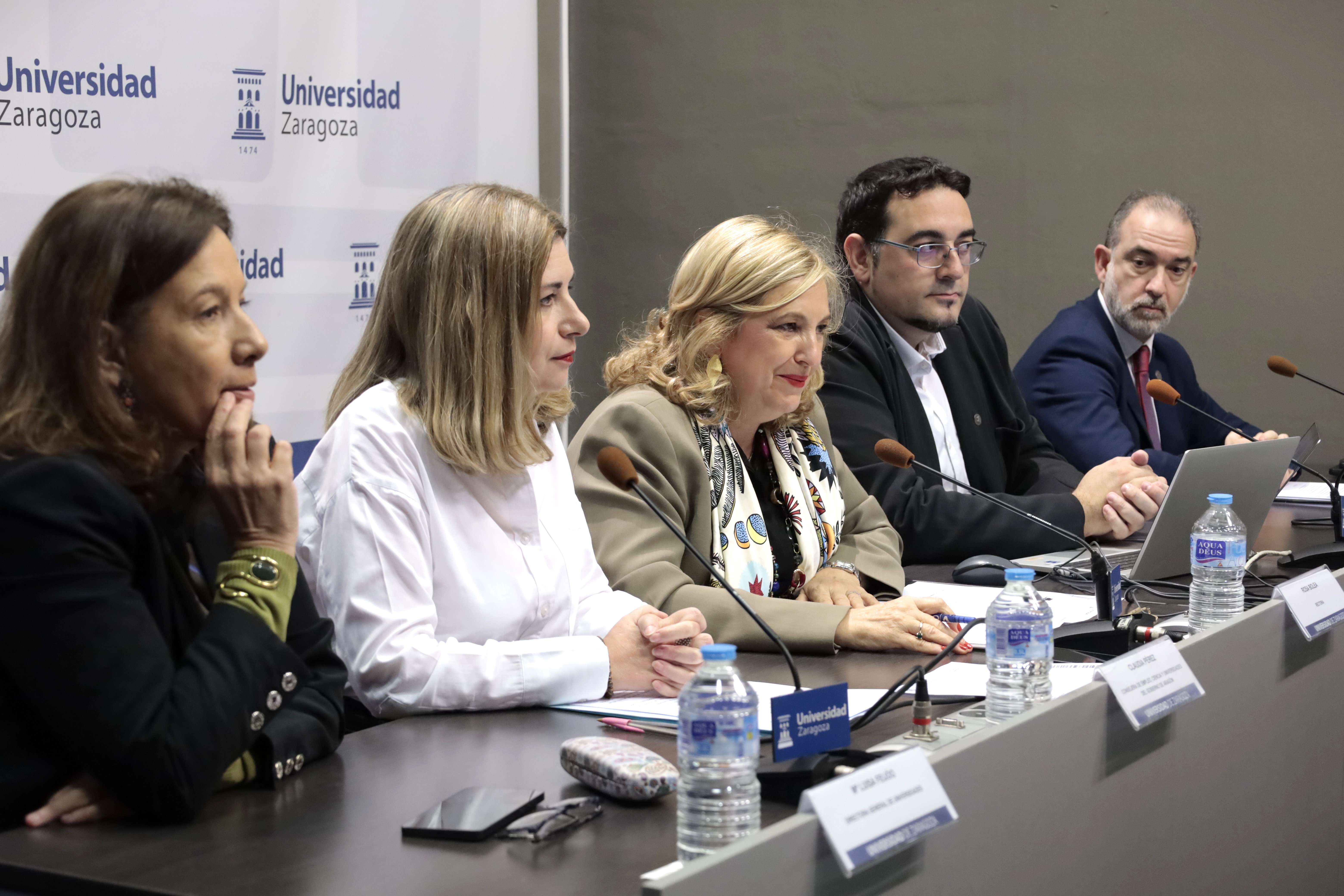 La rectora de la Universidad de Zaragoza, Rosa Bolea; la consejera de Empleo, Ciencia y Universidades del Gobierno de Aragón, Claudia Pérez; la directora general de Universidades, Marisa Feijóo; el vicerrector de Política Académica, Luis Morellón; y el vicerrector de Estrategia Digital e Inteligencia Artificial, Javier Fabra, han presentado hoy esta iniciativa pionera que busca acercar esta tecnología a todos los estudiantes desde el inicio de su etapa académica.