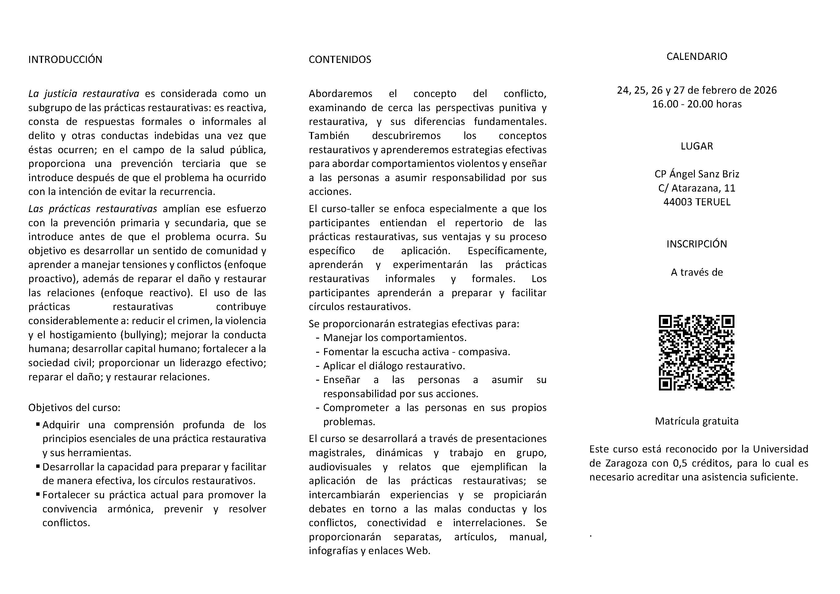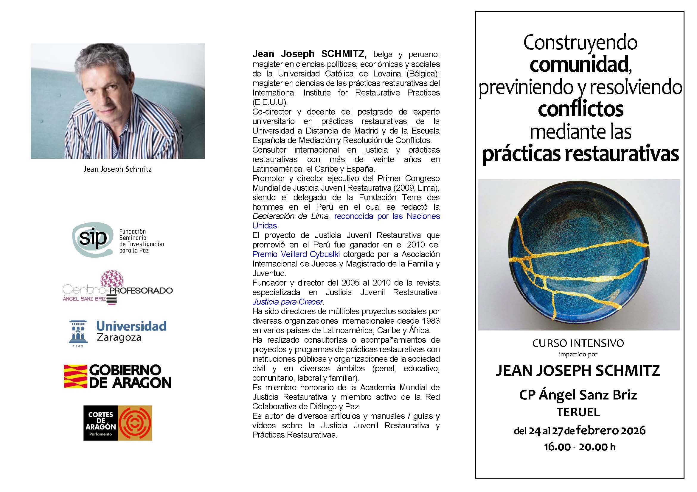 (Teruel, jueves, 19 de febrero de 2026). Teruel acogerá del 24 al 27 de febrero de 2026 el curso intensivo “Construyendo comunidad, previniendo y resolviendo conflictos mediante las prácticas restaurativas”, impartido por el consultor internacional Jean Joseph Schmitz, referencia en justicia restaurativa.