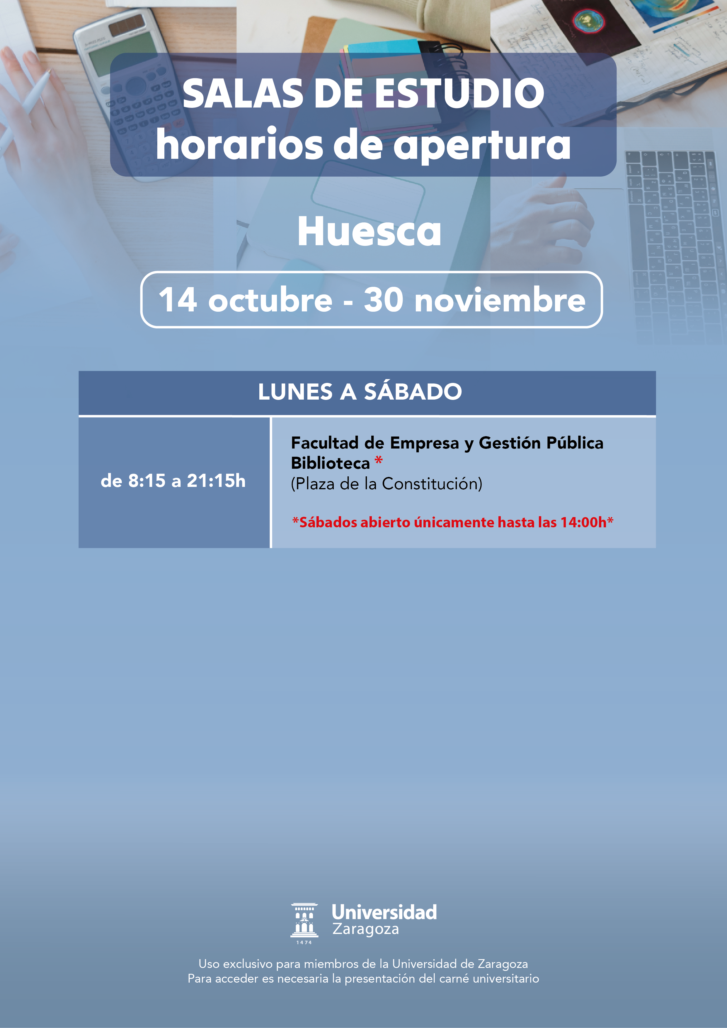 Última modificación Mié , 15/10/2025 - 10:37 Salas de Estudio HuescaHorarios de apertura14 octubre - 30 noviembreLunes a sábado de 8:15 a 21:15 h.Facultad de Empresa y Gestión Pública(Plaza de la Constitución)Sábados abierto únicamente hasta las 14:00 hs.